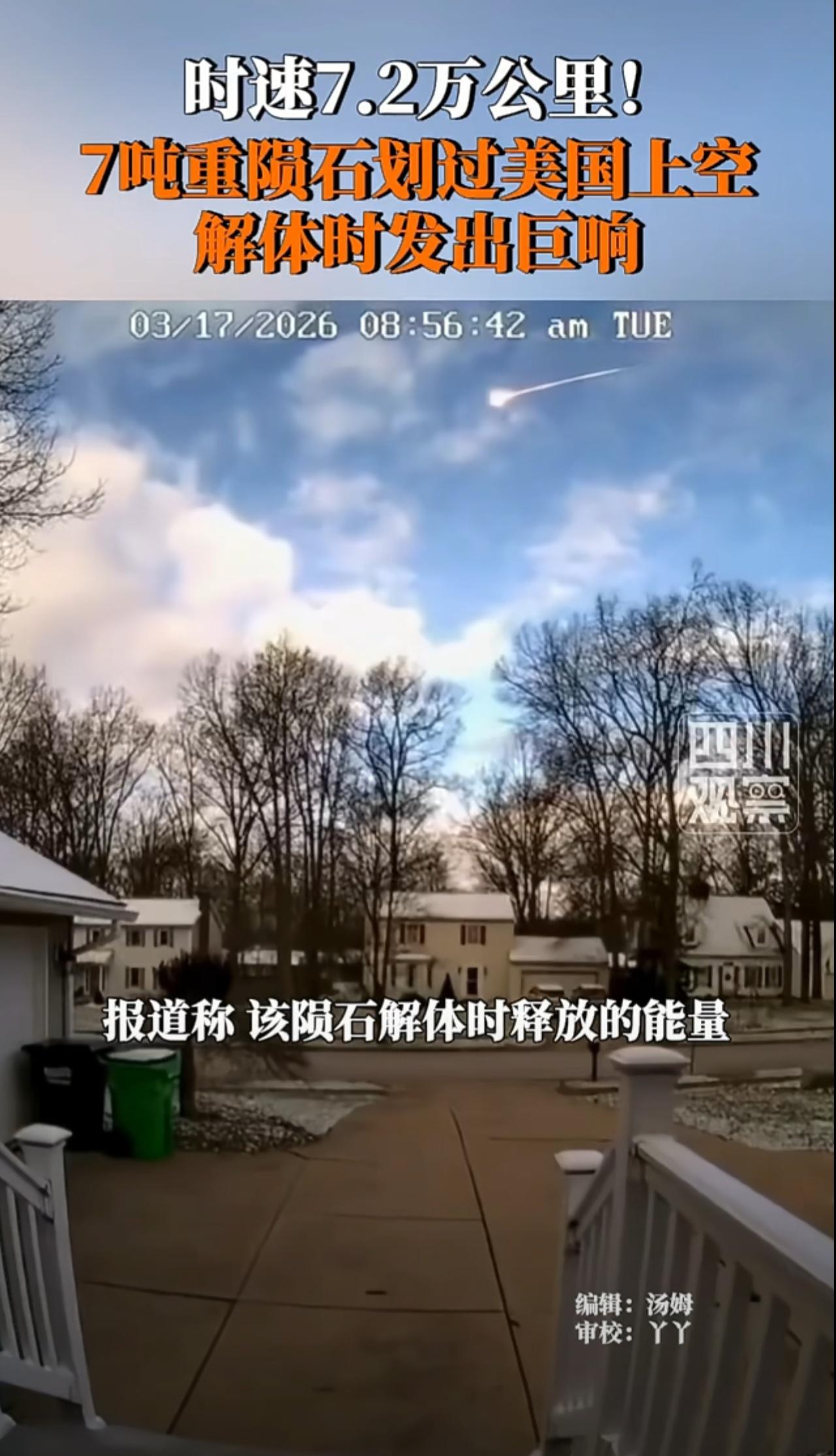 我还以为外星病毒降临美国来。[捂脸] 近日据美联社等媒体报道,一颗重达7吨的陨石当地时间3月17日以每小时4.5万英里(约合7.2万公里)的速度划过美国俄亥俄州克利夫兰上空,随后在巨大的轰鸣声中解体。 报道称,该陨石解体时释放的能量相当于250吨TNT炸药。 美国佬当地人很多人看到流星,要我马上许愿,中个一千万,不知道他们实现了么。 肯定有很多人还以为伊朗的原子弹轰过来了,吓得不轻,以科学角度看地球质量变轻了,离太阳更近了,太阳燃烧爆炸出来的火星陨石,撞地球。 所以石油我们少用,多用太阳能发电,不能老是消耗地球资源,我们得为地球创造新的质量。
