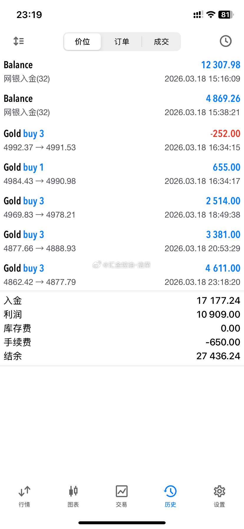 2026.3.18日操作5单,全胜!共收割890点利润。别焦虑,总会有不如意的事,生活从来都是泥沙俱下,鲜花与荆棘并存,我们带着诚意慢慢来,今天到此收工,晚安。黄金 金价 晚安