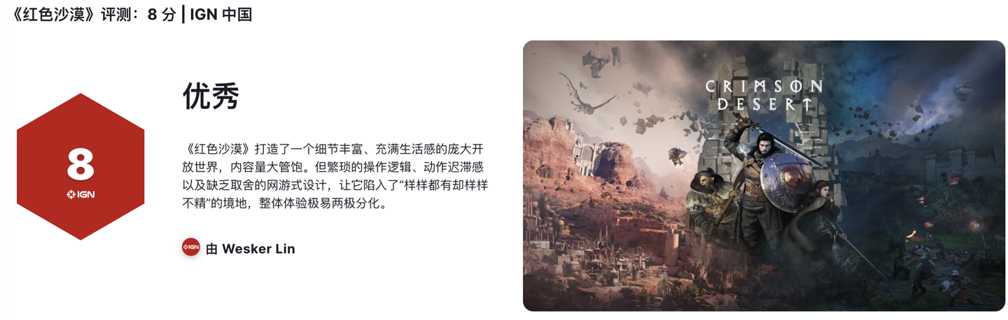 《红色沙漠》打造了一个细节丰富、充满生活感的庞大开放世界,内容量大管饱。但繁琐的操作逻辑、动作迟滞感以及缺乏取舍的网游式设计,让它陷入了“样样都有却样样不精”的境地,整体体验极易两极分化。