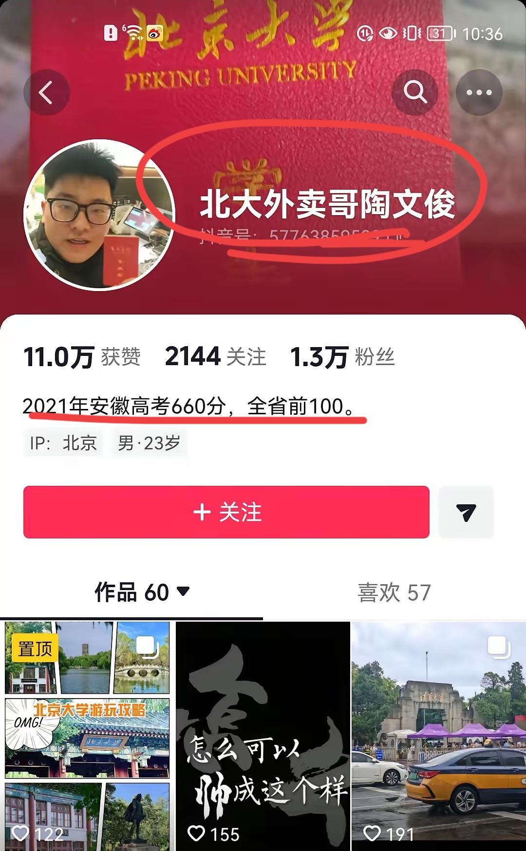 北大高材生,工作不顺失业了,跑外卖! 每天拍视频分享,竟然被封杀了~ 他是2021年考上北大的,分数660分,安徽省前100名!!其实啊,这些人都不是真正的跑外卖,真正跑外卖的,哪有时间去拍视频分享呢?每天跟时间赛跑,每天跑80,100单,怎么拍视频?他就是想通过这种反差,丢出圈,火起来,当网红直播带货,就是这样一个A逻辑!! 美团也出来回应了,他确实注册了众包骑手,不过,他仅仅跑了一天,总共完成五单,之后再也没跑了,看看吧,是不是这样一个套路?但还出圈了,又被封杀了,一言难尽啊,还是找个稳定的工作吧,网红这碗饭不好吃啊,外卖这碗饭你也吃不了!!