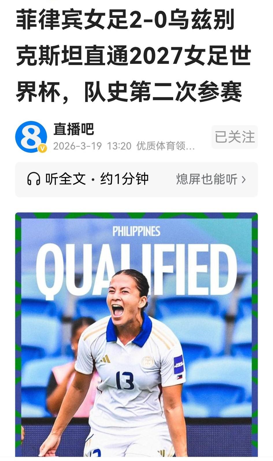 菜鸟互啄,漏洞百出,乌兹别克女足刚刚在亚洲杯附加赛0:2负于菲律宾女足,拱手让出巴西世界杯参赛资格。 这两队与日本和韩国队同处一个半区,在1/4比赛中,菲律宾队和乌兹别克队分别以0:7和0:6被日本队、韩国队狂虐。 由于本届亚洲杯同时也要选拔世界杯参赛队伍,由两场1/4赛淘汰的队伍打附加赛来决出。值得一提的是菲律宾队23名队员竟有22人是归化,还是在菜鸟大战中尝到了进军世界杯的大甜头。