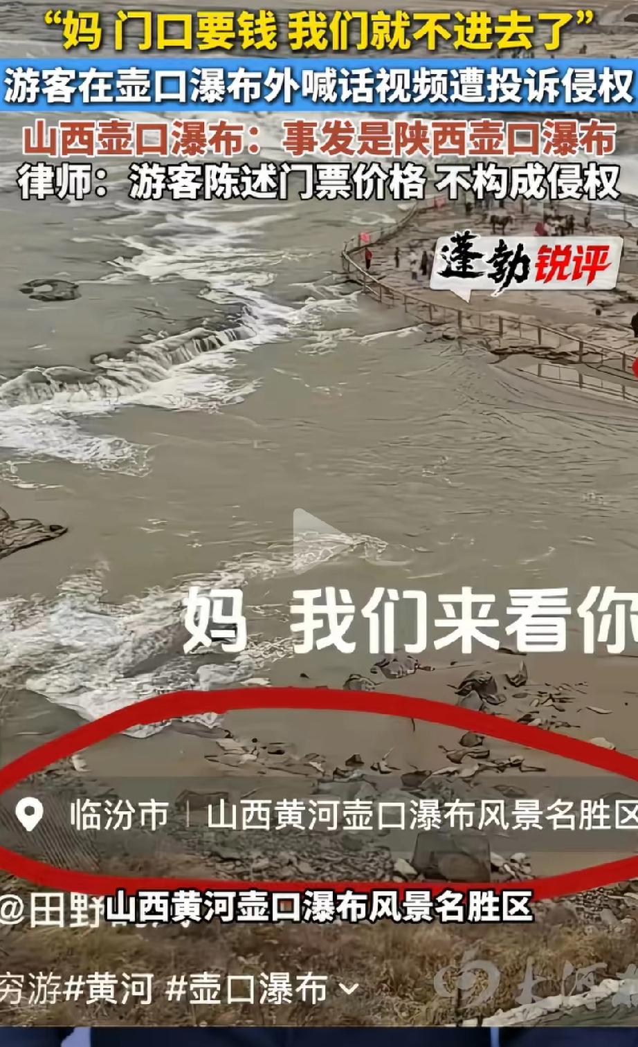 这下闹大了!大哥专程去看黄河壶口瀑布, 一看门票100块,没舍得进,拍了段视频对着黄河喊:“妈,我们来看你了,门口要钱,一人100,我们就不进去了。”结果呢?被景区投诉了,说人家“恶意攻击、诋毁”。律师:最初的视频没问题,不涉及侵权 事情特别简单,大哥满心欢喜去看黄河,到了陕西壶口瀑布景区门口,一看门票全价100元,心里琢磨着有点贵,就没进去。 他掏出手机,对着奔腾咆哮的黄河拍了段视频,语气特别心酸,还带着点自嘲,说:“妈,我们来看你了,门口要钱,一人100,我们就不进去了,在外面看看你就行。” 把黄河叫“妈”,是咱们中国人的老传统,母亲河嘛,这话就跟跟家里人唠嗑似的,没骂人也没编瞎话。 没想到,景区看到视频后不乐意了,直接投诉大哥,说他“恶意攻击、诋毁、歪曲事实”,还搬出“名誉权”这顶大帽子,更离谱的是,投诉里写了一句“壶口瀑布是我司开发的旅游景点” 。 大哥扛不住压力,只好拍了道歉视频。可这道歉一出来,网上彻底炸了锅,更巧的是,视频定位显示在山西壶口,导致山西壶口景区也被无辜牵连,工作人员直呼“我们是受害者” 网友们吐槽:“黄河是大自然亿万年冲出来的母亲河,啥时候成你们公司的私产了?” “人家就说句门票贵,实话实说也叫诋毁?” “谁出门旅游没遇到过‘来都来了,一看价格算了’的时刻啊,太真实了!” 律师也说,这不构成侵权,属正常感受陈述。 这话什么意思?用大白话翻译一下就是:人家说的是实话,没编瞎话,没骂人,就是表达了一下“嫌贵”的心情,这都不让说? 大哥没捏造任何事实,门票确实要100元,他只是陈述了客观价格,再加上自己觉得贵的主观感受,凭什么不能说? 景区收门票用于维护设施、改善服务,大家都能理解,毕竟运营也需要成本 。但连游客说句实话都受不了,还拿法律压人,这格局也太小了! 老百姓心里都有一杆秤。你服务做得好,一百块大家掏得心甘情愿;你动不动就投诉,一分钱大家也觉得堵心。 说到底,这事就三个理 第一个理:自然景观是公共资源。黄河是所有人的黄河,壶口瀑布是所有人的壶口瀑布。任何公司都可以提供服务,但不能把瀑布当成自家私产。 第二个理:说真话不犯法。门票确实是一百块,这是事实。嫌贵是主观感受,这也是实话。实话实说要是都算侵权,那以后景区门口是不是得立个牌子:“只准夸,不准嫌”? 第三个理:别把游客当敌人。游客是你景区的衣食父母,不是你的出气筒。人家大老远跑来,是冲着黄河的名气来的,不是冲着你“我司”来的。你觉得门票不贵,你可以解释,但不能捂嘴。 壶口瀑布外喊话被景区投诉侵了谁的权
