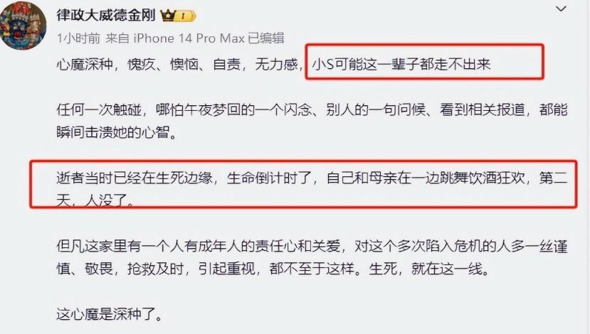 在小S心中大S胜过母亲,大S是她的精神支柱,在任何方面都能帮她兜底,她离不开大S。   人死不能复生,小S后悔也没用了,早知如此,何必当初!可   惜了一个孩子的母亲了,没有看到自己儿女长大成人!   这位律师的思维和文采真不错啊,通篇读下来杀伤力满满读下来,让人无力辩驳!