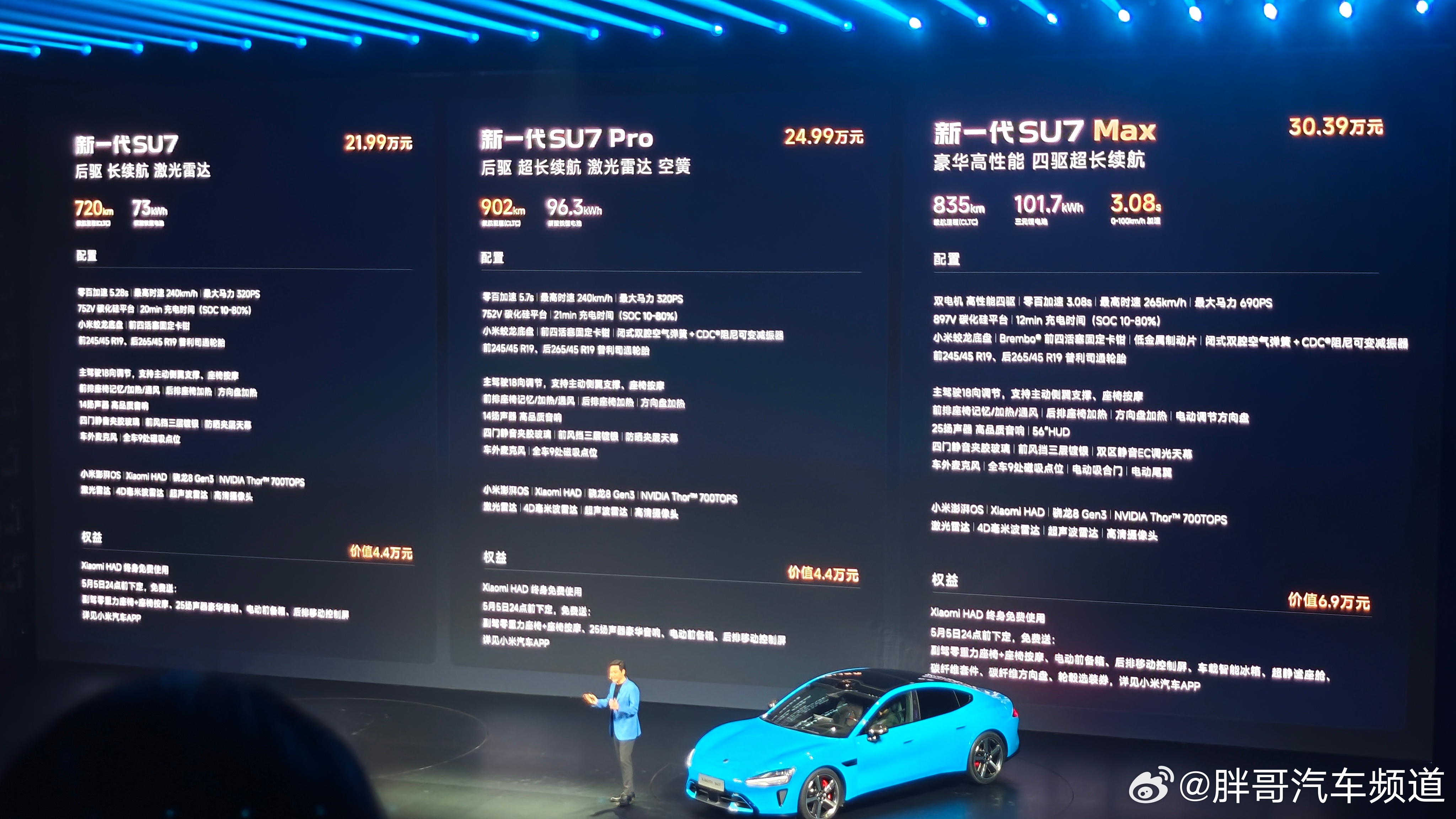 胖哥汽车频道 新一代小米SU7正式上市,共3款配置车型,售价区间为21.99-30.39万元。新车针对安全、驾控、智能及豪华质感四大维度进行升级,入门版车型即采用800V架构、V6s Plus电机、激光雷达以及Xiaomi HAD增强版等配置,综合产品力得到大幅提升。小米新SU7起售价21.99万元小米新SU7发布会请来半个车圈雷军感谢王兴兴给了投资宇树的机会