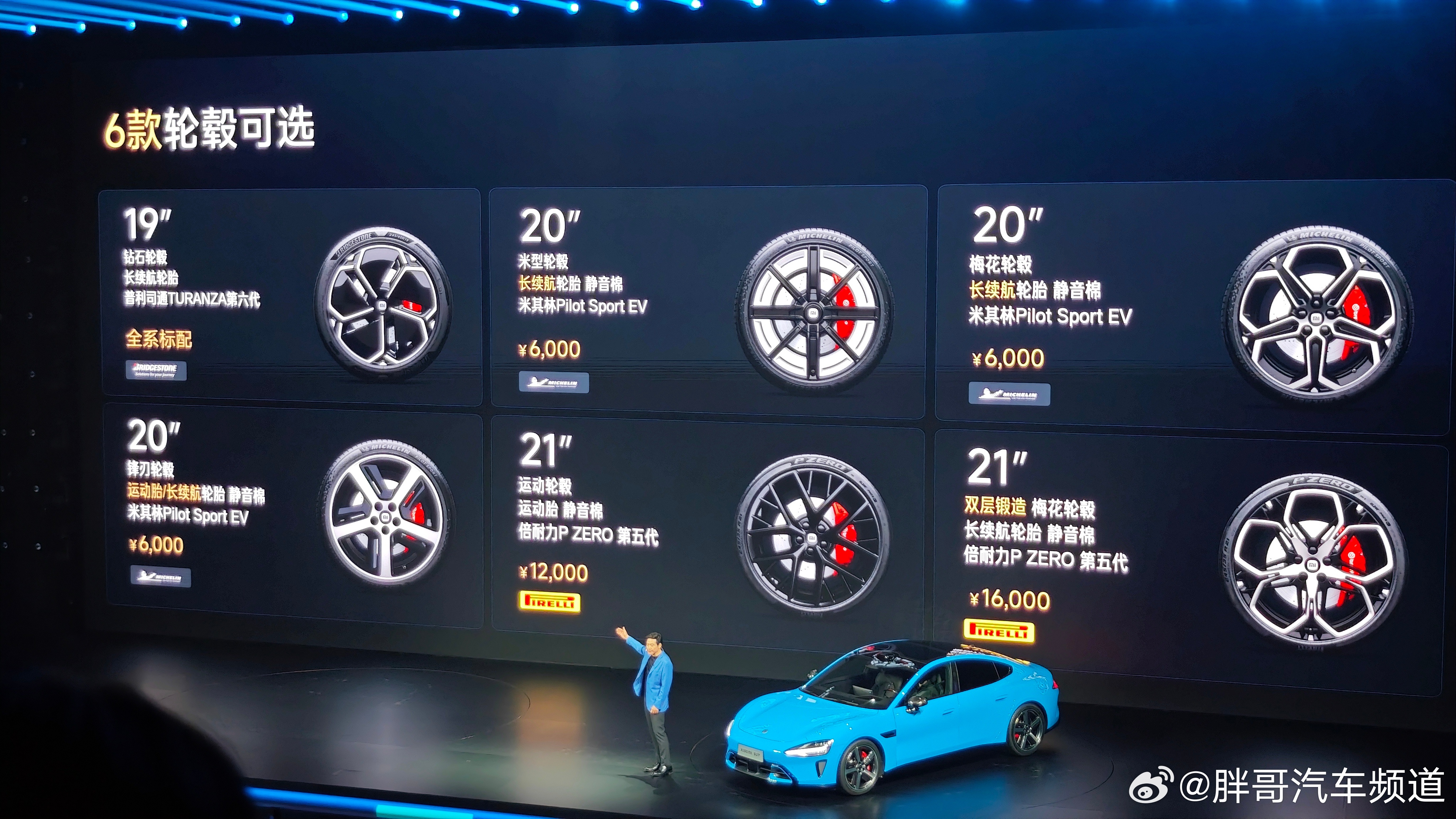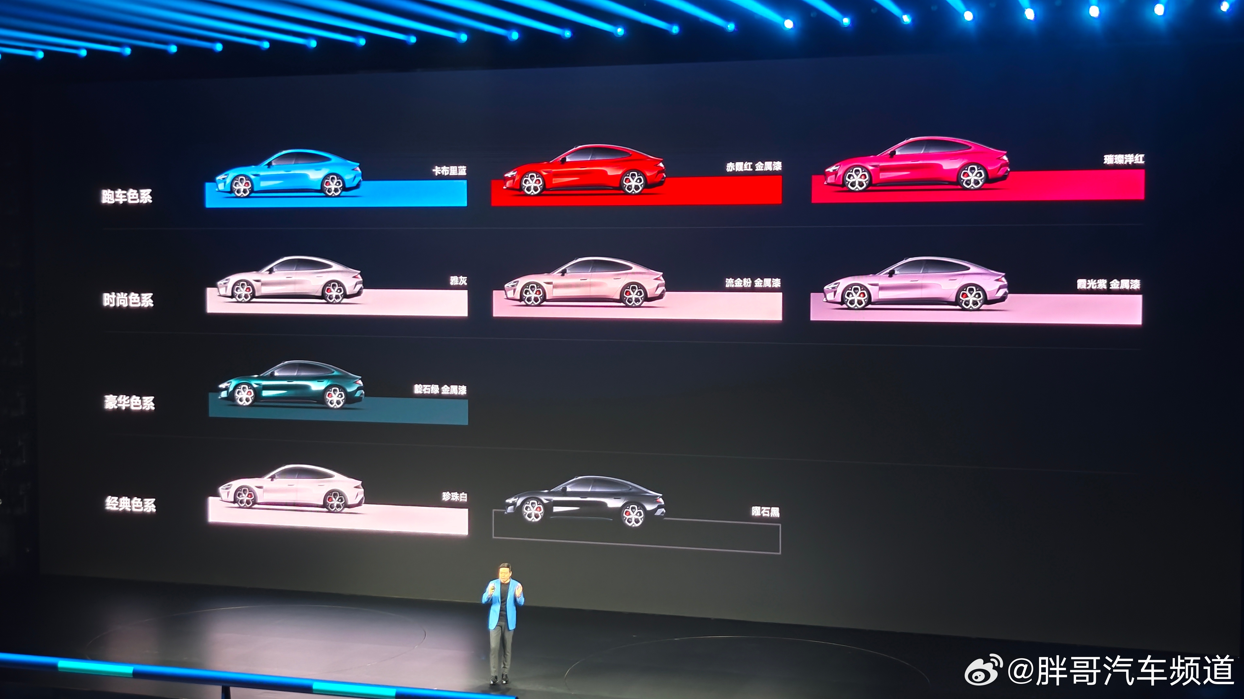 胖哥汽车频道 外观方面,新一代小米SU7主要是针对细节调整,如果想通过车头快速分辨新款/老款的话,最明显的差异主要是新车下包围通风口集成了毫米波雷达。此外,新车还会配备105L电动前备厢,可以容纳21英寸行李箱。在车身颜色方面,新一代小米SU7提供6款经典配色:霞光紫、璀璨洋红、雅灰、珍珠白、曜石黑、流金粉;以及3款全新专属配色:卡布里蓝、赤霞红和靛石绿,其中全新配色还会拥有专属20英寸锋刃轮圈及暗夜黑内饰。此外,轮圈共有6种选择,涵盖19英寸至21英寸多个尺寸。小米新SU7起售价21.99万元小米新SU7发布会请来半个车圈