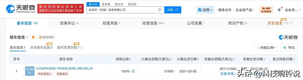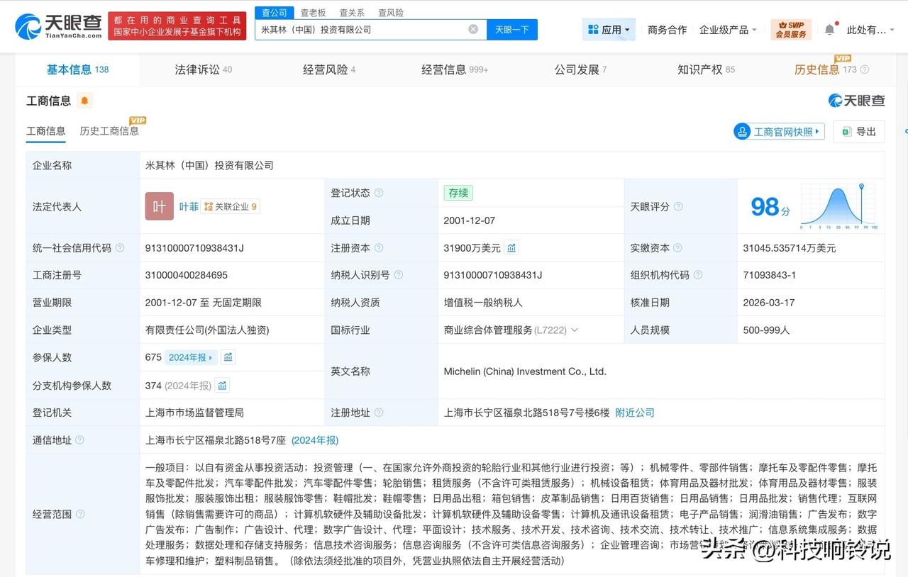 【米其林中国投资公司增资至3.19亿美元 增幅约42%】 天眼查工商信息显示,近日,米其林(中国)投资有限公司发生工商变更,注册资本由2.24亿美元增至3.19亿美元,增幅约42%。 该公司成立于2001年12月,法定代表人为叶菲,经营范围包括投资管理、轮胎销售、汽车零配件批发、机动车修理和维护等。股东信息显示,该公司由COMPAGNIE FINANCIERE MICHELIN全资持股。 天眼查信息: