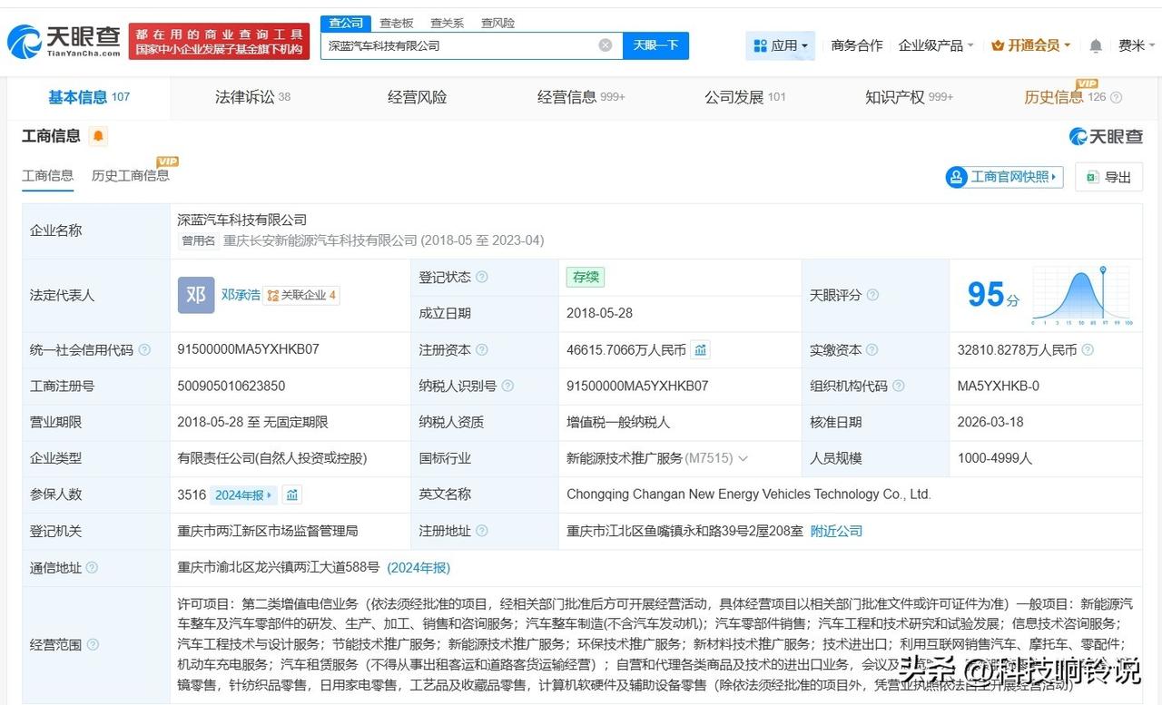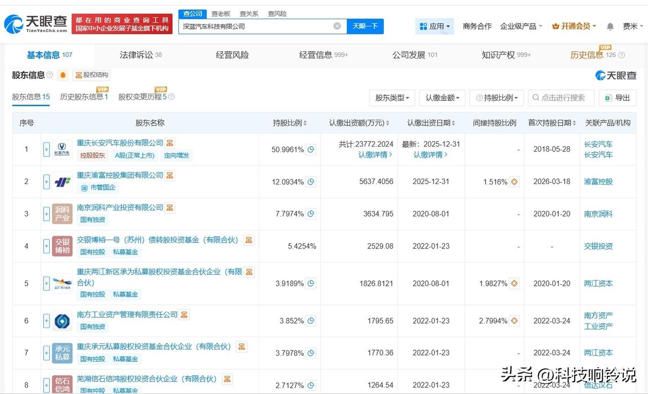 【长安汽车旗下深蓝汽车增资至4.7亿 增幅约42%】 天眼查工商信息显示,近日,深蓝汽车科技有限公司发生工商变更,新增重庆渝富控股集团有限公司、招银金融资产投资有限公司为股东,注册资本由约3.3亿人民币增至约4.7亿人民币,增幅约42%。 深蓝汽车科技有限公司成立于2018年5月,法定代表人为邓承浩,经营范围包括新能源汽车整车及汽车零部件的研发、生产、加工、销售和咨询服务等。股东信息显示,该公司由长安汽车(000625)、南京润科产业投资有限公司及上述新增股东等共同持股。 天眼查信息: