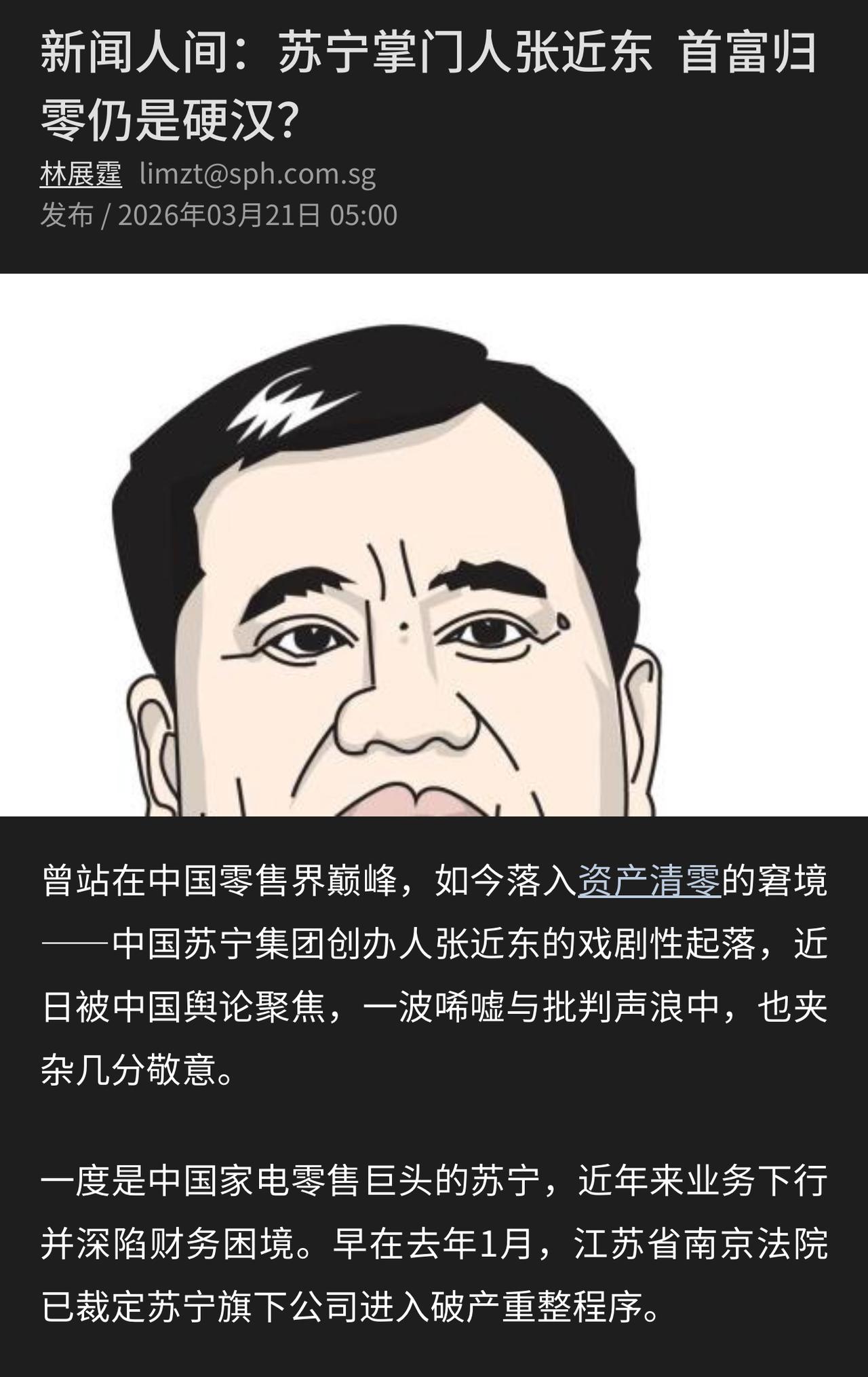 苏宁易购创始人、曾经的千亿富豪张近东财富成为0! 据媒体报道:苏宁2387亿的负债将通过信托处置,但是张近东个人的所有权益将完全失去!去年,苏宁旗下的公司已经进入破产程序! 一个时代的英雄就这样落幕了!国美电器黄光裕没有东山再起,苏宁易购张近东财产归零!他们曾为国家带来税收与就业,值得尊敬! 那个曾经控股国米、风光无限的张康阳,他会接受父亲财富归零的现实吗?