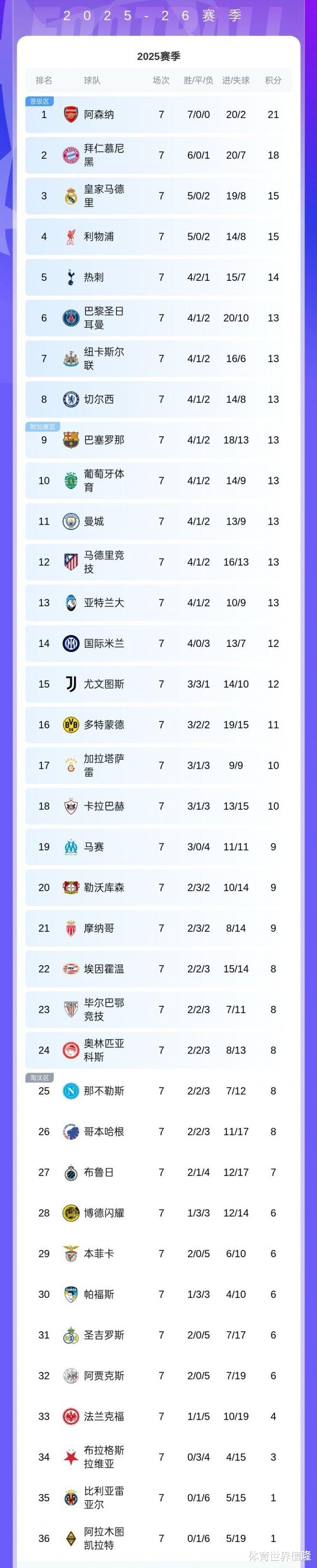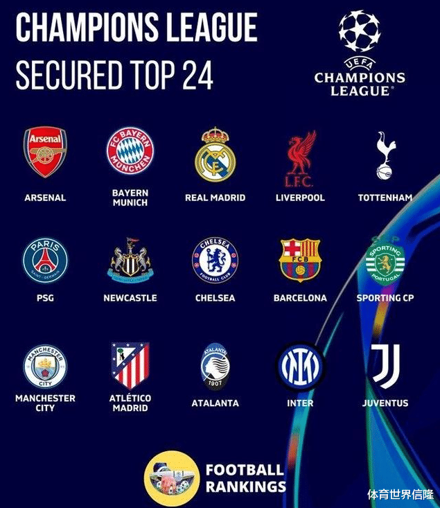 最终前八直通的球队积分大概率会在16分,预测前八的球队将是阿森纳、拜仁、皇马、利物浦、热刺、大巴黎、巴萨、切尔西。