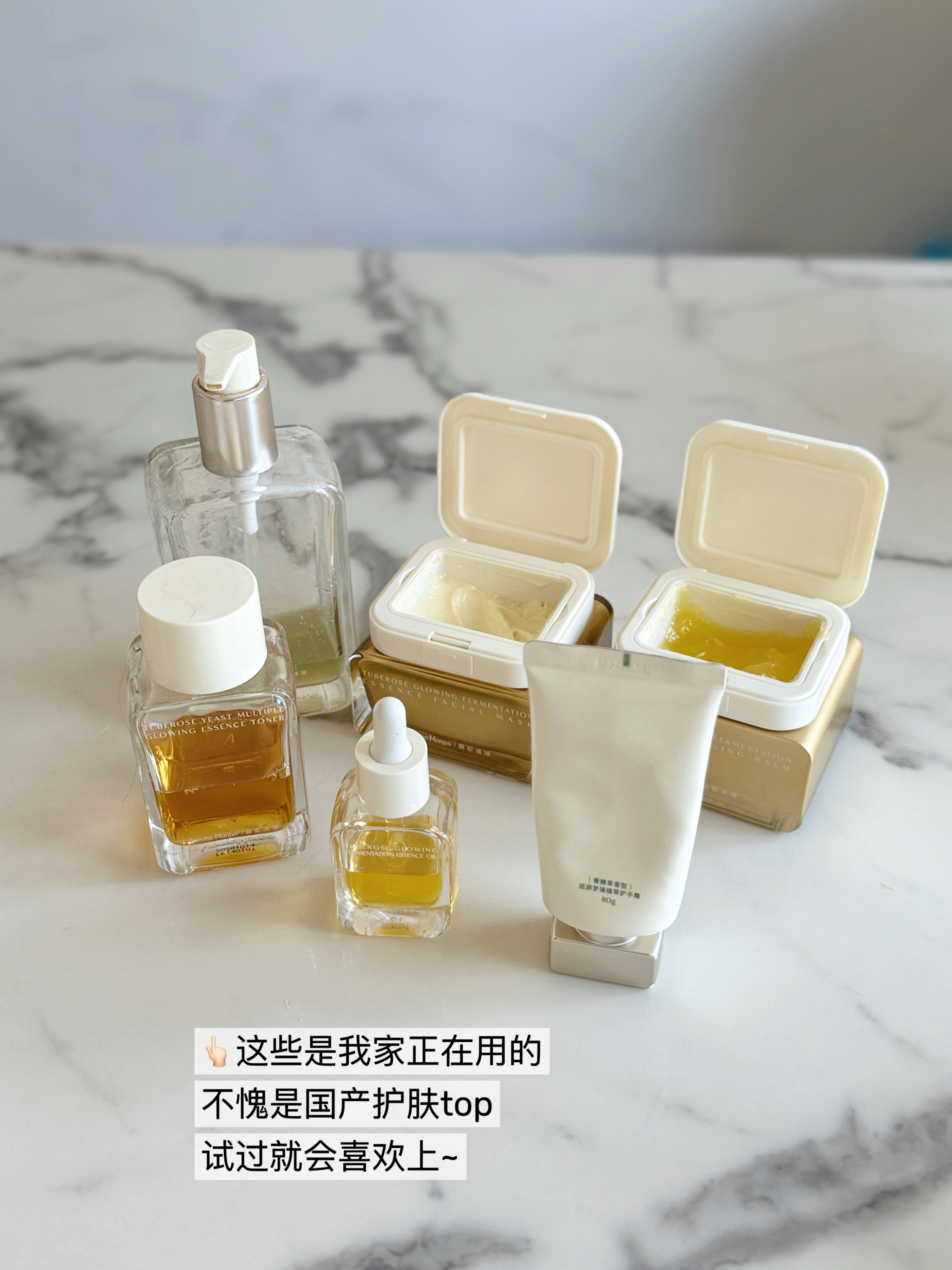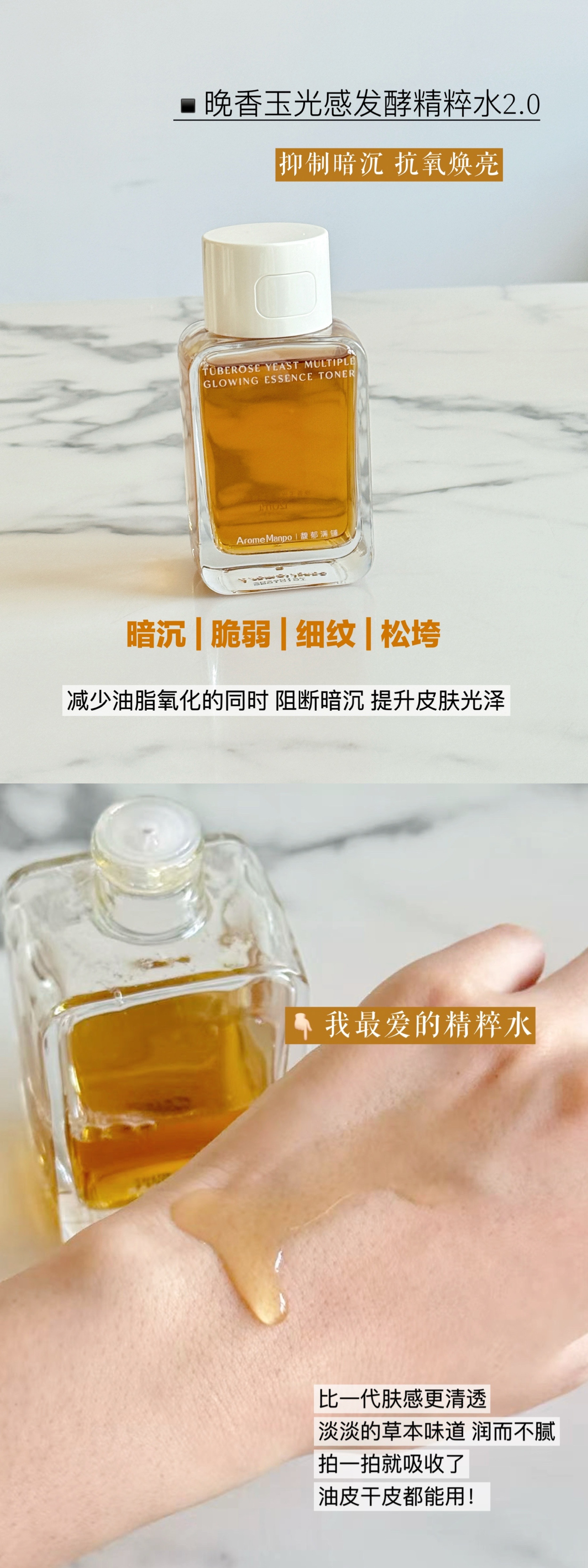 🌟晚香玉光感发酵精粹洁颜蜜以上都是我踏踏实实用好长时间的甚至空过瓶的产品,晚香玉精油协同多重植萃成分,专门针对暗沉和干燥,实现水油平衡。质地比普通爽肤水略稠一些,虽然含有精华油,但抹开即化水,吸收后皮肤会有自然光泽感,能即刻缓解洗脸后的紧绷感。