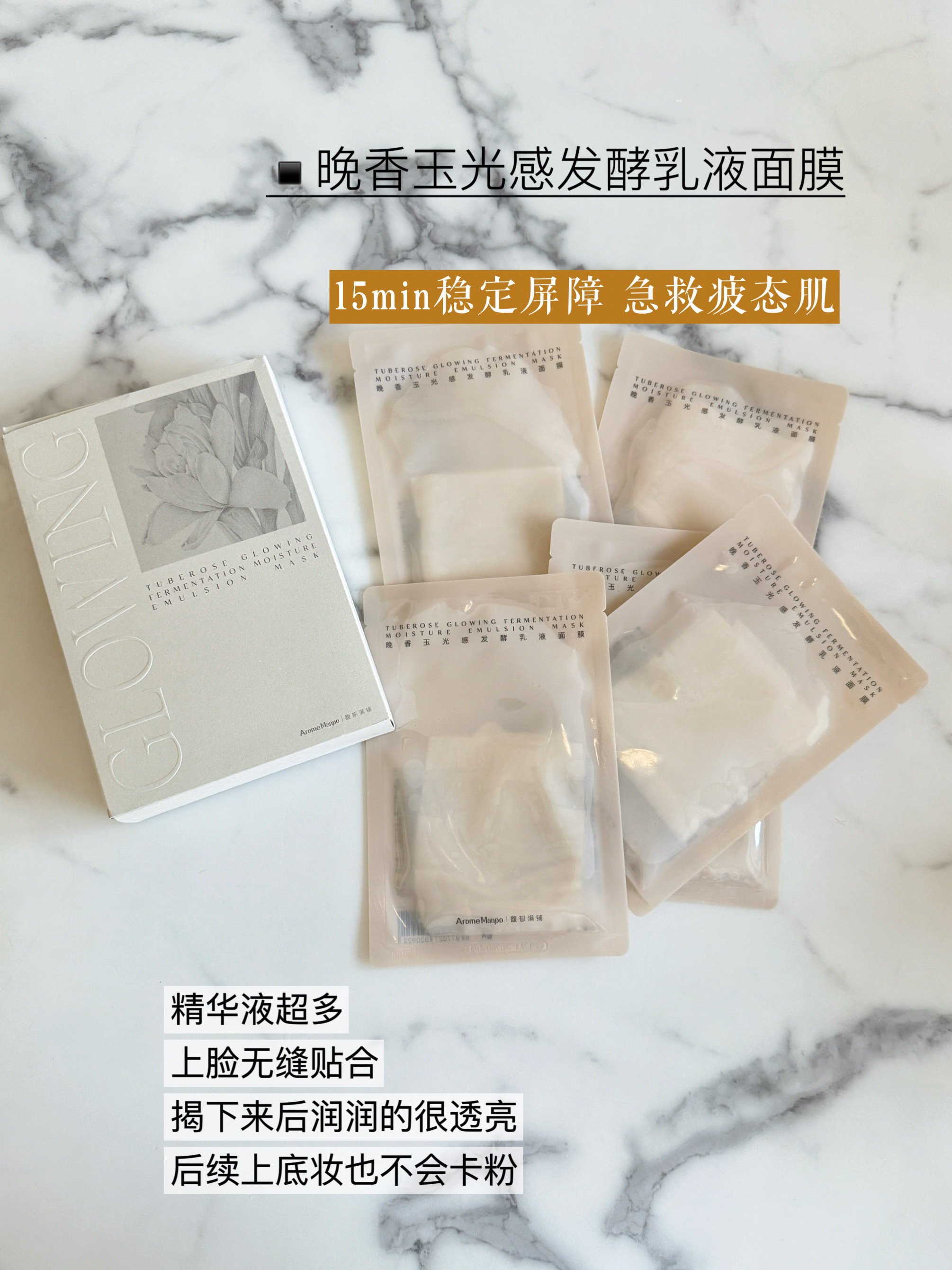 🌟晚香玉光感发酵乳液面膜是我复购过的好面膜,面膜布本身非常软,敷的过程中感觉脸在疯狂喝水,敷完以后不粘腻,不洗也不会觉得黏糊。早上敷一张,脸润一整天。