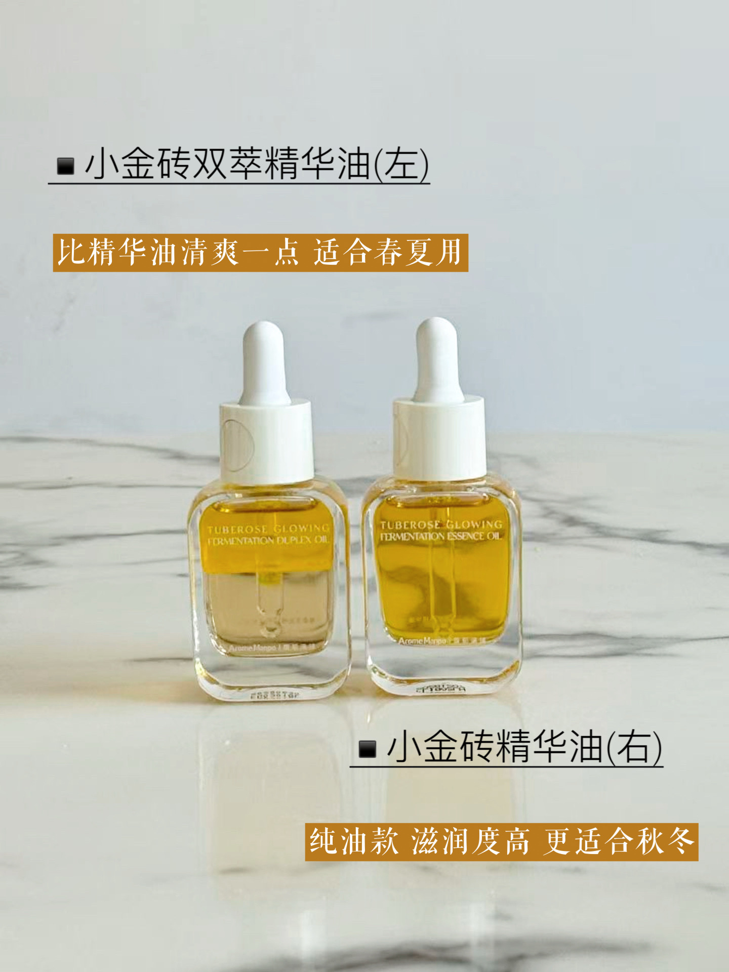 🌟晚香玉双萃精华油水油分层,用前摇匀,摇过之后是漂亮的凝珠状,我用在晚间护肤的最后一步。涂开后很快就吸收了,不闷不腻。配方结合了亲水和亲油成分,主打美白抗氧化,非常适合油皮和夏日的护肤油。
