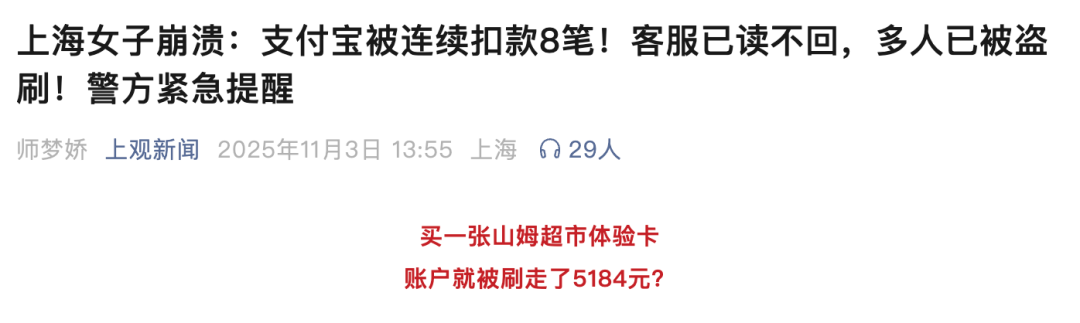 上观新闻报道,有人购买山姆会员卡,因为泄露账户密码或开通免密支付,账户被盗刷。