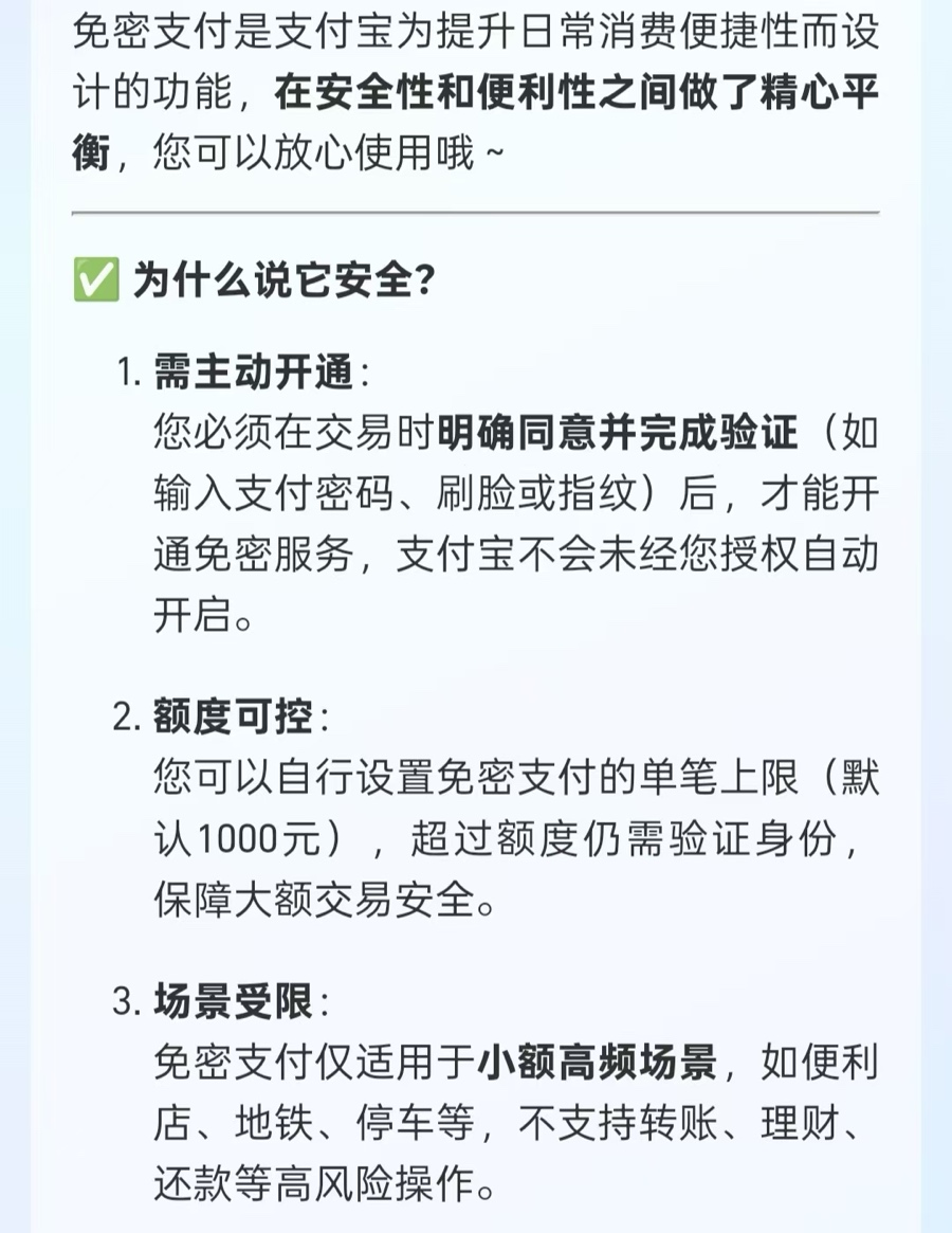 支付宝所谓的安全,是说免费支付需要用户主动开通,而且单笔免密上限是1000元,适用的场景是小额高频场景。