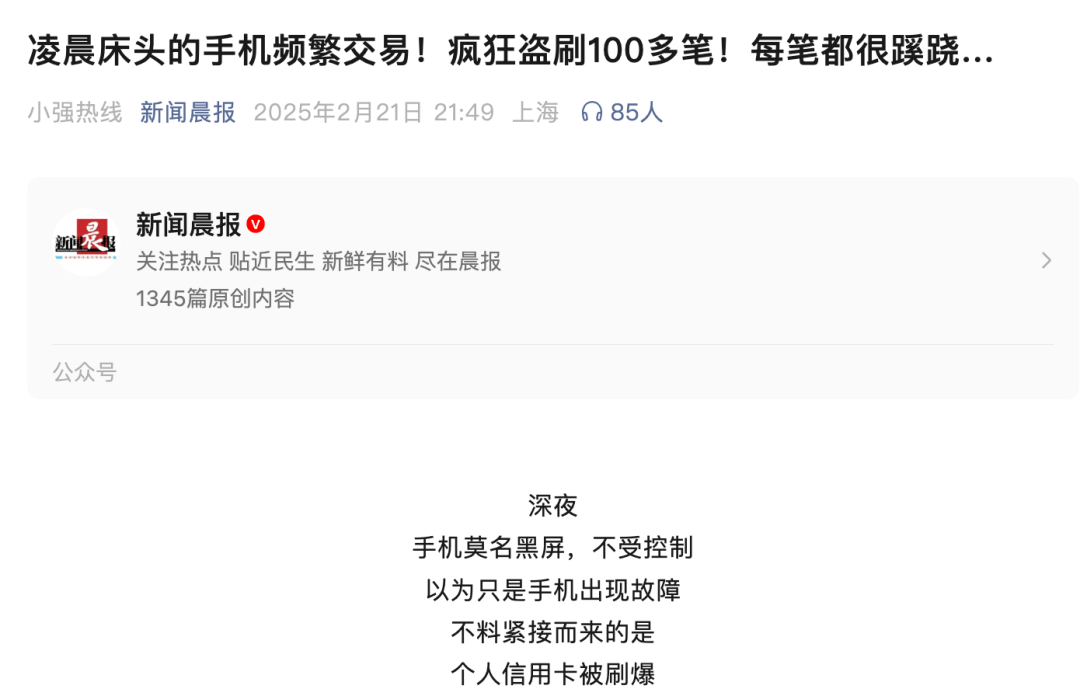 新闻晨报报道,有人手机放在床头,凌晨被盗刷100多笔,总额接近5万元。不仅银行卡被盗刷,花呗备用金也被提出来消费。