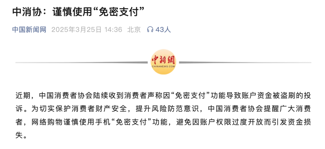 去年3月,因为投诉免密支付导致账户资金被盗刷的案例太多,中国消费者协会公开提示消费者,网络购物谨慎使用“免密支付”,避免权限过度开放引发资金损失。