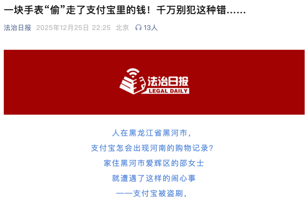 法治日报报道,有人买了智能手表绑了支付宝,退货后没有解绑支付宝,被人用支付宝付款码结账,盗刷5300多元。