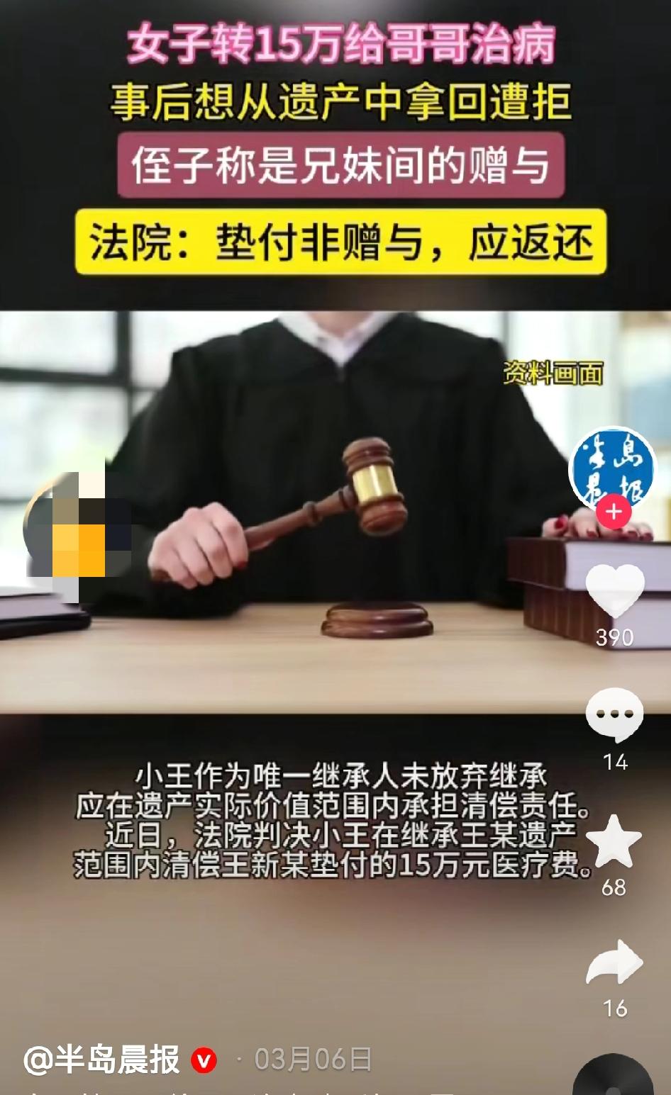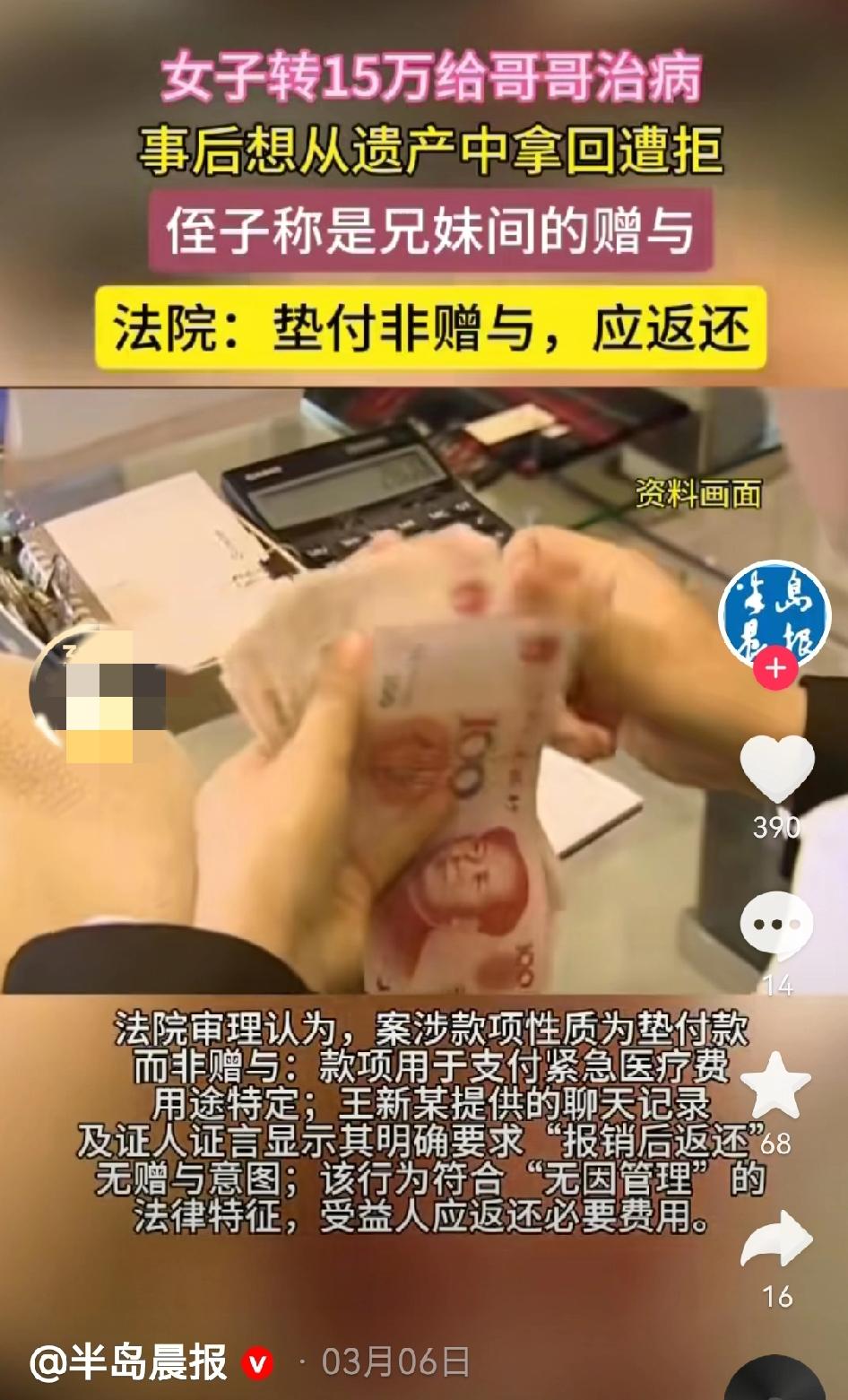 新疆,女子见哥哥病重,急需钱治疗,便毫不犹豫转给哥哥15万,让哥哥看病。可钱虽然花了,女子哥哥还是病逝了。哥哥的后事料理完毕后,女子找到哥哥的儿子,希望侄子能从哥哥的遗产中返还上述15万元。不曾想,侄子称女子那15万元是对自己父亲的赠与,有微信聊天记录为凭,但女子却不认可。法院这样判! 据悉,2023年,男子王某因病情严重选择住院治疗。 期间,王某的妹妹得知消息,来到医院探望,询问哥哥王某的病况。 看见躺在病床上的王某,王某妹妹心急如焚,希望哥哥赶紧好起来。 得知哥哥急需钱进行治疗后,王某妹妹开始用银行卡及微信进行转账。 短短2个月的时间,王某妹妹向王某转账了15万元,这些钱全部被用来支付王某的医疗费。 但王某的病情太严重了,医生回天乏术。2024年9月,王某病逝。 由于跟哥哥感情很好,王某妹妹实际上将王某的后事处理完毕。 处理王某后事的期间,王某妹妹获悉王某还留有遗产。 由于当时自己是出于给哥哥垫付医疗费才转的账,王某妹妹就想让王某的儿子,也就是自己的侄子在王某的遗产范围内将15万元返还给自己。 有了这个想法后,王某妹妹找到了侄子,将上述想法告知了侄子。 不曾想,侄子拒绝了,理由是王某与王某妹妹是亲兄妹,出钱看病是情分,明显属于赠与! 担心姑姑否认后,侄子向王某妹妹出示王某与妹妹的微信聊天记录。 微信聊天记录这样写着,“兄妹间还客气吗?……这个钱就算是给你买得开心吧。” 对于侄子断章取义的做法,王某妹妹很委屈。 王某妹妹称,自己确实是出于兄妹情谊转的钱,但这并非是赠与,而是垫付医疗费。 与哥哥王某家人的微信聊天记录中,王某妹妹明确写着,“你只要把看病报销部分还给我就行了”。 见侄子仍然拒绝,王某妹妹将侄子起诉至法院,主张侄子在继承王某遗产范围内返还其垫付的医疗费。 为了证明自己的主张,王某妹妹还申请证人出庭佐证,证明垫付和报销后处理的事实存在。 对于本案,法律上怎么评价呢? 从民事案由来看,本案属于被继承人债务清偿纠纷。 实践中,处理此类纠纷,主要查明以下事实是否存在:债权人与被继承人之间是否存在债权债务关系?如存在,被继承人是否留有遗产?如留有遗产,继承人是否放弃继承被继承人的遗产? 从上述案情来看,本案的核心争议在于15万元的款项性质到底是赠与款?还是垫付款? 如果是赠与款,赠与行为已经完成,双方就不存在返还钱款的法定义务,王某妹妹与王某就不存在债权债务关系。 但如果是垫付款,双方就存在债权债务关系。 《最高人民法院关于适用〈中华人民共和国民事诉讼法〉的解释》第九十一条规定,人民法院应当依照下列原则确定举证证明责任的承担,但法律另有规定的除外: (一)主张法律关系存在的当事人,应当对产生该法律关系的基本事实承担举证证明责任; (二)主张法律关系变更、消灭或者权利受到妨害的当事人,应当对该法律关系变更、消灭或者权利受到妨害的基本事实承担举证证明责任。 依据在案证据,法院认定15万元的用途具有特定性和紧迫性,双方的真实意思表示为垫付,并非赠与,王某妹妹与王某的法律关系属于无因管理。 我国《民法典》第九百七十九条第一款规定,管理人没有法定的或者约定的义务,为避免他人利益受损失而管理他人事务的,可以请求受益人偿还因管理事务而支出的必要费用;管理人因管理事务受到损失的,可以请求受益人给予适当补偿。 基于上述规定,王某妹妹虽然与王某是亲兄妹,但王某有自己的儿子,王某妹妹对王某并无法定扶养义务。 在这种情况下,王某妹妹属于管理人,王某属于受益人,王某应该向王某妹妹返还。 如此分析,王某妹妹与王某有债权债务关系。 我国《民法典》第一千一百二十四条第一款规定,继承开始后,继承人放弃继承的,应当在遗产处理前,以书面形式作出放弃继承的表示;没有表示的,视为接受继承。 由于王某有遗产且王某的儿子没有放弃继承王某的遗产,王某妹妹有权要求王某儿子在其继承王某遗产范围内承担清偿责任。 最终,法院判令王某儿子在继承王某的遗产范围内向王某妹妹清偿垫付的医疗费。 本案的发生提醒广大网友,对于款项来往,我们还是应该明确其性质,千万别使款项的性质处于模糊不清的地带,为将来主张权利带来麻烦。 对于本案,你怎么看?欢迎评论,感谢关注@蜗牛说法 ---------------