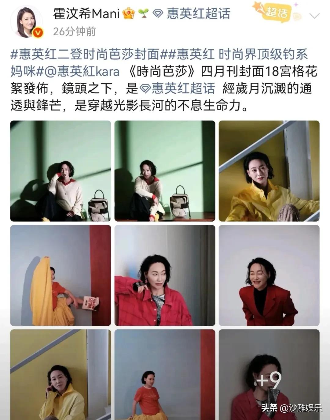 谢霆锋经纪人,激动官宣! 3月24日,英皇金牌经纪人霍汶希突然在社交平台高调发文,字里行间难掩兴奋与赞誉之情。这一波操作,直接把网友的好奇心拉满了——能让见惯大场面的霍汶希如此激动,到底是谁? 答案揭晓:惠英红。 原来,惠英红再度登上《时尚芭莎》四月刊封面,18宫格拍摄花絮同步释出,瞬间引爆网络热议。霍汶希此番发文,正是为自家这位影后级别的“宝藏艺人”高调打call。 作为华语影坛的传奇女演员,这已经是惠英红第二次拿下《时尚芭莎》封面资源。要知道,时尚圈向来是年轻面孔的天下,能在65岁的年纪两度登封,这本身就是一个极具分量的信号——真正的时尚感,从来不被年龄定义。 花絮中,惠英红一口气解锁了多套风格迥异的造型: 米白拼红针织衫配黑裤,慵懒随性,像是午后阳光里的一杯热茶;亮黄色廓形衬衫搭同色系阔腿裤,明媚又有力量,站在那里就是一幅画;红格纹外套叠穿银色内搭,复古与前卫在她身上完美交融;还有那套酒红色西装造型,干练飒爽,气场全开,隔着屏幕都能感受到那股“生人勿近”的女王气场。 但真正让网友破防的,不是衣服,而是惠英红本人的状态。 镜头里的她,眼神里既有历经岁月沉淀的通透从容,又藏着穿越光影长河的不息生命力。或倚墙浅笑,或托腮沉思,每一个姿态都松弛得恰到好处,却又满满都是故事感。 什么叫“顶级钓系”?这就是。没有刻意讨好的表情,没有用力过猛的姿态,她只是站在那里,你就忍不住想多看几眼,想读懂她眼里的那些故事。 说实话,看惠英红拍时尚大片,比看某些年轻爱豆硬凹造型舒服太多了。 她的美,不是那种“精修到毛孔都没有”的工业美,而是一种被生活打磨过、被岁月浸润过的真实美。她的眼神里有故事,她的皱纹里有经历,她的每一个表情都不是在“演”,而是在“活”。 惠英红用一次次亮眼表现证明了一件事:真正的魅力,和年龄无关,和底气有关。而这份历经半生打磨的底气,才是她最动人的标签。 从打女到影后,从低谷到巅峰,她的人生本身就是一部大女主剧。如今65岁的她,依然在突破,依然在发光——这才是真正的“岁月不败美人”。
