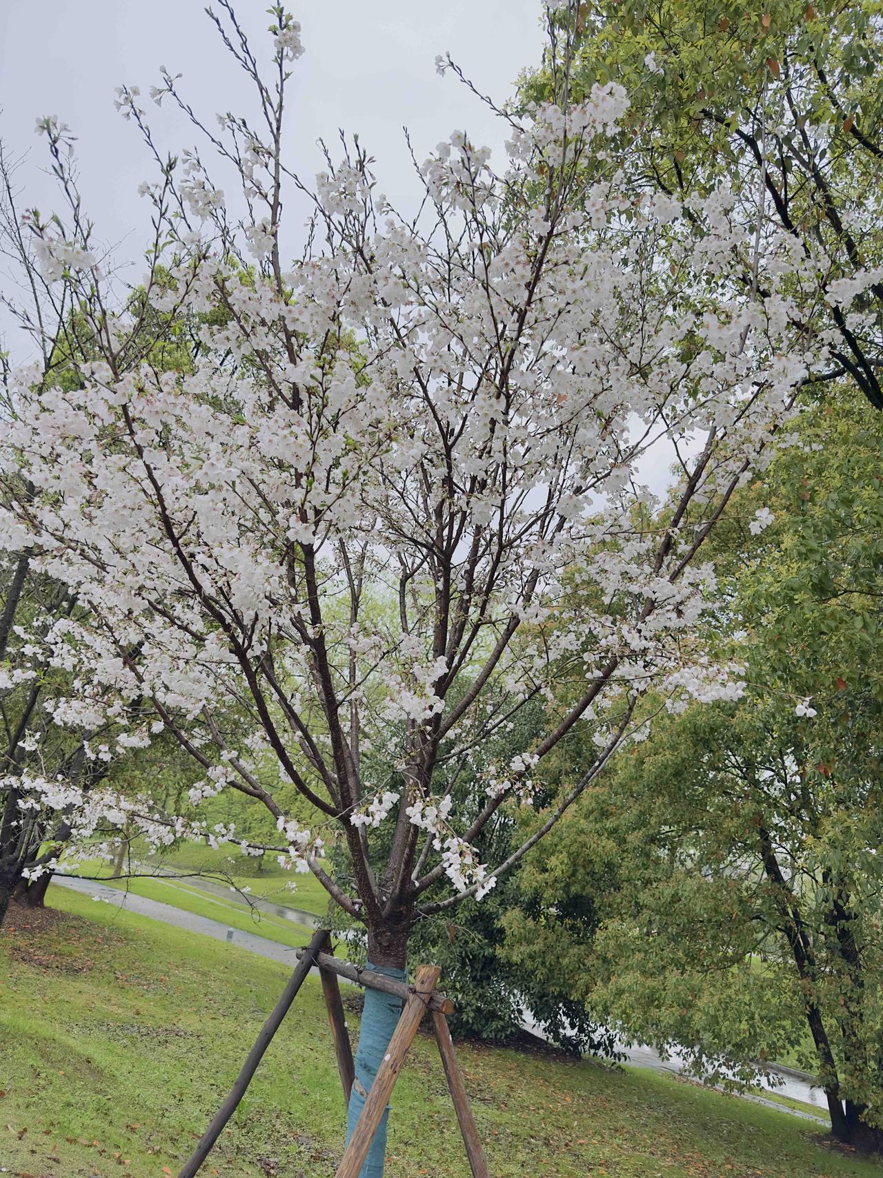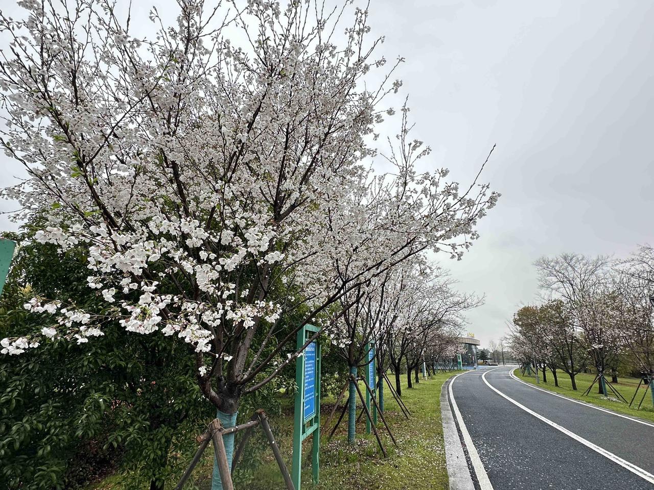 下午快4:00的时候,突然想起湿地公园的白樱花应该开了吧,不想错过美好花期,于是在四人小圈里邀约伙伴“湿地公园看樱花,有要去的吗?” 20分钟后,一个小伙伴回应“太晚了。”即兴在小圈群里发了几个图片,另一个伙伴回应“在上班。”如果早点邀约,除了那个上班的,另外两个贪玩的伙伴都会来。 大概是因为下雨吧,偌大的公园开始只有我一个人,后来才渐渐地来了几个跑步的年轻人。 今天所看到的樱花,不知道是开过了还是还没有全开,并不像往年看到的那样灿若云朵,洁白无瑕。尽管眼前的景致不及我想象的那般,我还是很有兴致地独自走在这条樱花大道上一边欣赏一边拍图。 遇到园艺工人在干活,我就向人家打探“这樱花是开过了还是还没有全开?为什么今年的樱花不是全白,而是有点泛红呢?”他说:“老树的花还没有开,现在开花的是去年新栽种的樱花树,品种不一样,花朵有点泛红。” 原来是这样。突然想起孔子名言:“三人行,必有我师焉。”“知之为知之,不知为不知,是知也。”