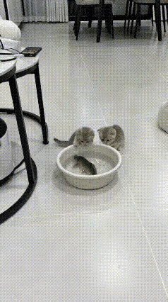 主人刚买了一条鱼放在塑料盆里,两只小猫崽闻着腥味跑过来。看到这条比自己身子还长的鱼,两只小猫崽不知道该怎么才能把它捞出来?它俩你一下,我一下的去抓鱼,可根本抓不上来。一只小猫咪抬头看了拍视频的主人一眼,开口叫了一声,见主人没有阻止。于是纵身跳进盆里,骑到了鱼的背上,客厅里顿时水花四溅。