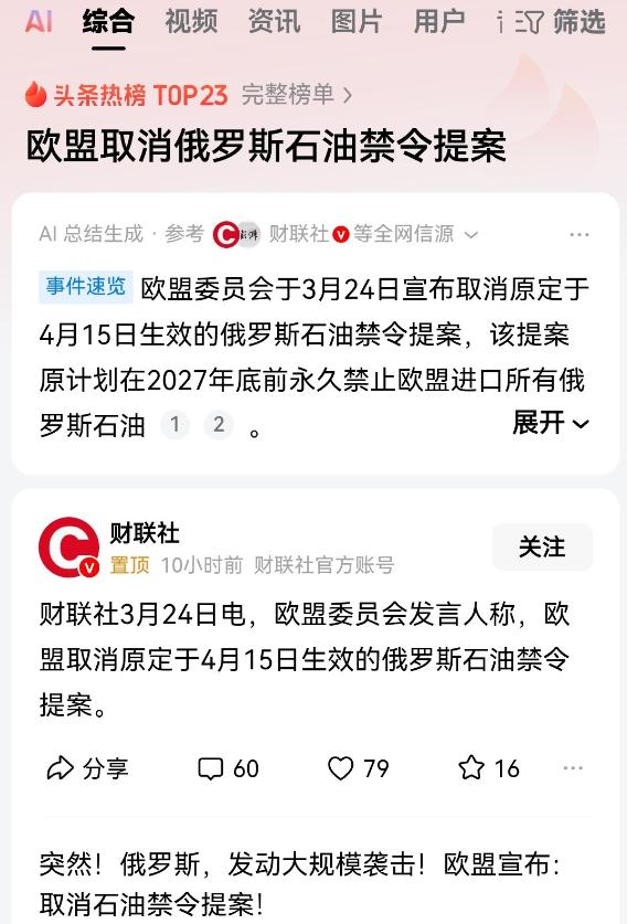 欧盟这是一点脸都不要了,说着最硬的话,挨着最狠的打! 欧盟委员会于当地时间3月24号对外宣布,取消掉原本定于4月15号生效的俄罗斯石油禁令 有意思吧?这就是挺乌的结果,这就是制裁俄罗斯的结果 现在全傻眼了 本来4月15号欧盟决定永久禁止欧盟,国家使用俄罗斯的石油 这就是彻底的脱钩啊,结果万万没有想到,中东战争爆发了,全球石油危机爆发了 他们立刻怂了 俄乌冲突爆发之后,欧盟就一门心思跟着美国走,把对俄能源制裁当成彰显立场的筹码,完全不顾自己的能源家底有多薄弱。 2022 年开战前,欧盟有 27% 的原油、近三成的成品油都要靠俄罗斯供应,管道直通东欧,运输方便又便宜,是欧洲工业和民生的稳定命脉。 可欧盟偏要赌一口气,非要把这条命脉掐断,先是逐步削减进口,把俄石油占比硬生生压到 3% 以下,还敲定了 4 月 15 号的永久禁令。 扬言到 2027 年底彻底清零俄石油进口,一副要和俄罗斯拼到底的架势,话说得比谁都硬,姿态摆得比谁都高,仿佛只要制裁到位,俄罗斯就会服软,欧洲就能高枕无忧。 为了实现这个所谓的 “能源脱钩”,欧盟费尽心机找替代货源,转头去求美国、中东国家,甚至远渡重洋从北非买油,可这些替代石油不仅距离远、运输成本高,价格更是比俄油贵出一大截。 欧盟原本以为咬咬牙就能扛过去,没想到天不遂人愿,中东局势突然全面升级,霍尔木兹海峡这个全球石油运输的咽喉要道几乎被掐断,全球三成的海运石油都要走这里,如今油轮滞留、运输中断,中东石油根本运不出来。 国际油价应声暴涨,布伦特原油直接冲破 107 美元一桶,较年初涨幅接近 50%,创下三年来新高,欧洲的能源替代计划瞬间泡汤,彻底陷入了无油可用、高价买不起的绝境。 这场石油危机最先遭殃的就是欧洲普通老百姓,日子过得苦不堪言。德国家庭的能源支出占比,从战前的 7% 飙升到 22%,柏林一户普通人家的月均取暖费,从 140 欧元涨到 390 欧元,翻了近三倍。 法国、意大利的加油站,油价直接突破 2 欧元每升,加一箱油要花掉普通人小半天的工资,老百姓出门开车都要精打细算,低收入家庭甚至要在 “取暖” 和 “吃饭” 之间二选一。 各地的抗议游行此起彼伏,民众对着欧盟官员喊着要油价、要生活,可欧盟除了空喊口号,根本拿不出解决办法,之前的强硬姿态,在民生疾苦面前一文不值。 比民生更惨的是欧洲的工业根基,直接被能源危机打崩了。德国作为欧洲经济的火车头,现在平均每 20 分钟就有一家企业破产,2025 年全年破产企业超 2.4 万家,创下十年新高。 化工巨头巴斯夫、钢铁巨头安赛乐米塔尔,纷纷关掉德国本土工厂,把产能搬到能源成本更低的亚洲和美国;大众、宝马等汽车企业,也因为能源价格过高,缩减德国生产线,大量工人面临失业。 瑞典的电池企业 Northvolt,原本是欧洲新能源的希望,最终也因为能源成本差距过大申请破产,欧洲的制造业正在一步步被掏空,曾经的工业强国荣光,在盲目制裁下荡然无存。 反观被制裁的俄罗斯,不仅没被打垮,反而活得越来越滋润。欧盟减少进口后,俄罗斯立刻把石油转向亚洲市场,中国、印度大量采购俄油,不仅出口量没降,反而因为油价上涨赚得盆满钵满,卢布汇率保持稳定,国家财政还有盈余。 欧盟本想通过制裁掐断俄罗斯的经济来源,结果俄罗斯找到了新的市场,反倒是欧盟自己陷入了能源荒、经济滞胀的泥潭,这简直是天大的讽刺,所谓的制裁,不过是欧盟自欺欺人的把戏。 欧盟之所以落得这般下场,根源还是自己的短视和软弱。欧洲本土石油产量极低,对外依存度高达 58%,原本依赖俄罗斯的管道石油是最经济的选择,可偏偏要为了所谓的 “价值观” 放弃稳定供应,去追求不切实际的脱钩。 中东局势一爆发,替代货源断裂,欧盟立刻没了主心骨,之前放的狠话、定的禁令,说取消就取消,连一点缓冲都没有,脸面丢得一干二净。 这充分说明,在国家利益和民生生计面前,欧盟所谓的立场和强硬,全都是经不起考验的空话,一旦触及自身利益,立马变脸妥协,毫无原则可言。 从制裁煤炭、天然气,到如今取消石油禁令,欧盟一步步被现实打脸,每一次都在重复同样的错误。 为了迎合美国,不惜牺牲本国百姓的生活、掏空自己的工业基础,到头来不仅没伤到俄罗斯分毫,反而让自己陷入经济衰退、民生凋敝的困境。 这次取消石油禁令,就是欧盟彻底认输的标志,之前有多嚣张,现在就有多狼狈,说着最硬的话,挨着最狠的打,把自己的脸面踩在地上摩擦。 说到底,国际博弈从来不是靠喊狠话就能赢的,不顾自身实际、盲目跟风站队,最终只会自食恶果。