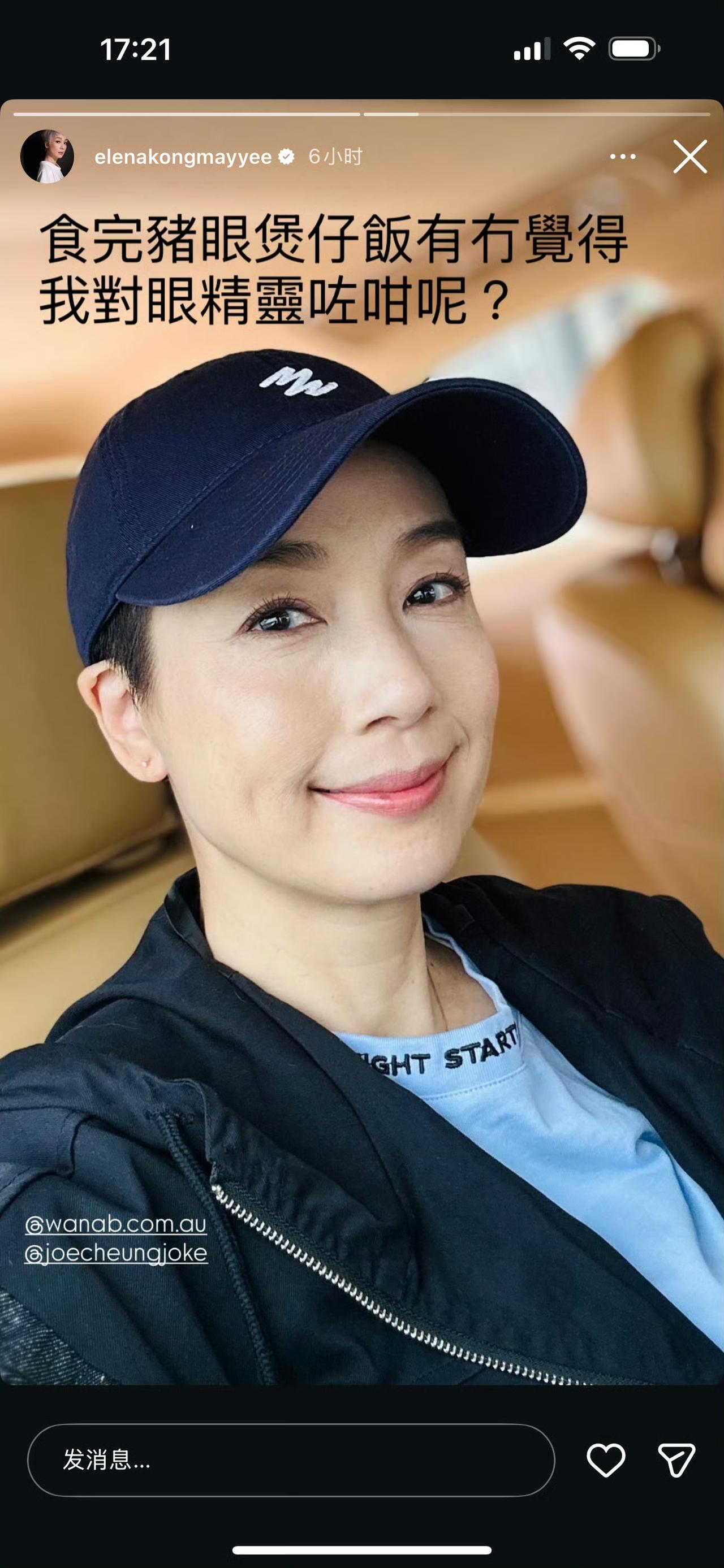 tvb艺人江美仪(Elena Kong)在社交平台发布的动态,配文道“吃完猪眼煲仔饭,有没有觉得我的眼睛变得很灵动呀?”。 从照片来看,她的眼睛明亮有神,睫毛纤长卷翘,眼中似乎带着笑意,显得灵动而富有神采,配合她俏皮的文案,更增添了几分活泼的氛围。背景看起来像是在车内或者类似的室内座椅环境中,整体给人一种轻松分享生活小趣味的感觉。