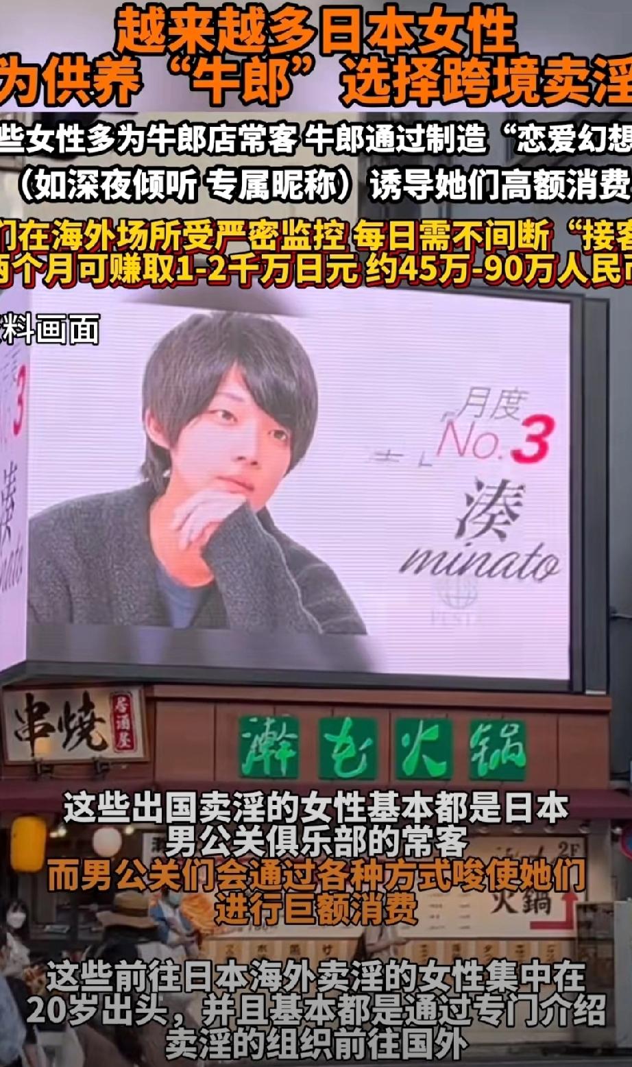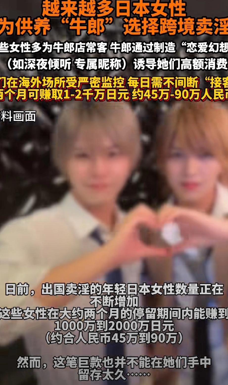 在日本,流行追牛郎文化。为追到心仪的牛郎,越来越多的女性为供养牛郎,不惜跨境卖淫。 所谓的牛郎就是男公关俱乐部(牛郎店)为客人提供情绪价值的男性服务者。从客人的消费获得提成。供养则是客人消费越多,牛郎的排名越靠前,提成也就越多。 日本社会,女性的情感空虚。牛郎趁机用甜言蜜语灌迷魂汤。使得女性掉入陷阱不能自拔,成为了牛郎的提款机。不少女性借高利贷来讨牛郎的欢心,甚至跨国卖淫来供养牛郎。 供养牛郎,折射出资本对情绪的异化和性别权力的失衡,是现代版的“南洋姐”悲剧的再现。