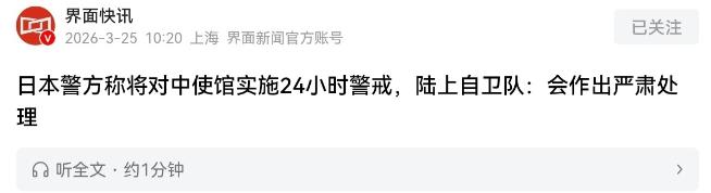 日本终于出来回应了!在发生强闯中国驻日本大使馆事件之后,日本方面给回应了!3月25日,日本陆上自卫队回应表示,将全面配合警方调查。而日本警方说,对此事深表遗憾,并表示将对中国驻日使馆实施24小时警戒。很显然,面对我们的外交关切,日本开始重视了。 当地时间3月24日上午9点左右,一名23岁的日本男子,名叫村田晃大,是日本陆上自卫队的三等陆尉,隶属于宫崎县的一个驻地。 他没有经过任何允许,从中国驻日使馆隔壁大楼的四楼,翻过大使馆的院墙,强行闯入了使馆院内,还带着一把长达18厘米的刀具,并且发出了恐吓言论,甚至威胁要杀死中国的外交人员。 好在咱们使馆的工作人员反应及时,很快就把这个人控制住了,没有造成人员受伤。之后,使馆方面就把情况通报给了日本麻布警察署,警方赶到后,就把这个叫村田晃大的人接管了,到了当天晚上9点左右,警方以涉嫌非法侵入建筑物的罪名,把他正式逮捕了。 后来经过调查,村田晃大自己也承认,确实是未经允许闯入使馆的,他还说,要是没能见到中国大使、没能表达自己的意见,就打算用带的刀自杀,以此来引起重视。 这件事发生后,咱们中国方面第一时间就表明了态度,非常严肃。中国驻日本大使馆立刻就向日本外务省提出了严正交涉,表达了强烈抗议,要求日方必须彻查这件事,严惩那个不法分子,给咱们中国一个负责任的交代,同时还要切实采取措施,保护好中国驻日使馆的馆舍、工作人员的安全,杜绝以后再发生类似的事情。 3月25日,咱们国家外交部发言人林剑也在例行记者会上,再次强调了中方的立场。他说,这件事严重违反了国际上的规矩,也就是《维也纳外交关系公约》,严重威胁到了咱们外交人员的人身安全,扰乱了使馆的安宁,也损害了咱们国家的尊严。 这也暴露了日本方面,没有尽到保护外国使馆和外交人员的责任,对自己的自卫队人员管理不到位。林剑还反问日本媒体,从来没有见过有人未经允许、带着刀闯入使馆,只为了和大使交谈的,要求日方必须全面、严肃地彻查这件事。 面对咱们中国的强烈抗议和严正交涉,日本方面终于有了回应,而且态度明显比之前认真了不少。首先是日本陆上自卫队,他们明确表示,会全面配合日本警方的调查,等到把事情的来龙去脉查清楚之后,一定会对涉事的村田晃大作出严肃处理,不会敷衍了事。 要知道,村田晃大是陆上自卫队的现役军官,这件事也让日本自卫队的形象受到了影响,他们的回应也是对自身失管失教的一种表态。 除此之外,日本警方也给出了回应,他们首先对这件事表示了深深的遗憾,承认没有尽到安保责任。同时,警方还明确表示,从现在开始,会对中国驻日本大使馆实施24小时不间断的警戒,确保不再发生类似的强闯事件。 根据了解,这次的24小时警戒可不是随便说说,而是有具体的措施,比如每天安排三班警察轮流值守,常驻几十名警力,其中还有防暴警察,在使馆围墙外设置固定岗哨,增派巡逻车,还新增了高清夜视摄像头和传感器,监控画面直接连到警方指挥中心,甚至把使馆上空500米范围设为无人机禁飞区,就是为了全方位保护使馆的安全。 大家都能看出来,日本这次的回应,明显是重视了咱们中国的外交关切。要是换做以前,可能他们只会简单敷衍几句,不会有这么具体的行动。 这次之所以这么认真,一方面是因为这件事性质太恶劣,是日本自卫队现役军官闯馆,还带了刀具、发出恐吓,要是不严肃处理、加强安保,很可能会影响中日两国的关系;另一方面,也是咱们中国的态度足够坚决,无论是驻日使馆的严正交涉,还是外交部的明确表态,都给了日方足够的压力,让他们不得不重视起来,履行自己的国际义务。 不过咱们也要清楚,光有回应还不够,关键要看实际行动。日本警方说要实施24小时警戒,就要真正落实到位,不能只是做个样子;陆上自卫队说要配合调查、严肃处理,也要拿出实际举措,查明村田晃大闯馆的真实动机,严惩不贷,同时加强对自身人员的管理,避免以后再出现这样的问题。毕竟,大使馆的安全,关系到咱们国家的尊严和外交人员的人身安全,容不得半点马虎。 这件事也再次提醒我们,国家的强大,才是咱们外交人员和驻外机构安全的最大保障。正是因为咱们中国越来越强大,说话越来越有分量,日本方面才会重视咱们的关切,及时给出回应、采取措施。 后续我们也会继续关注这件事的进展,看看日方能不能真正做到言出必行,彻查事件、严惩凶手,切实保护好咱们中国驻日使馆的安全。