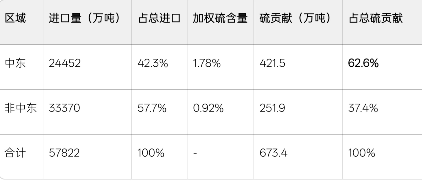 - 中东硫贡献占比:421.5 ÷ 673.4 = 62.6%
