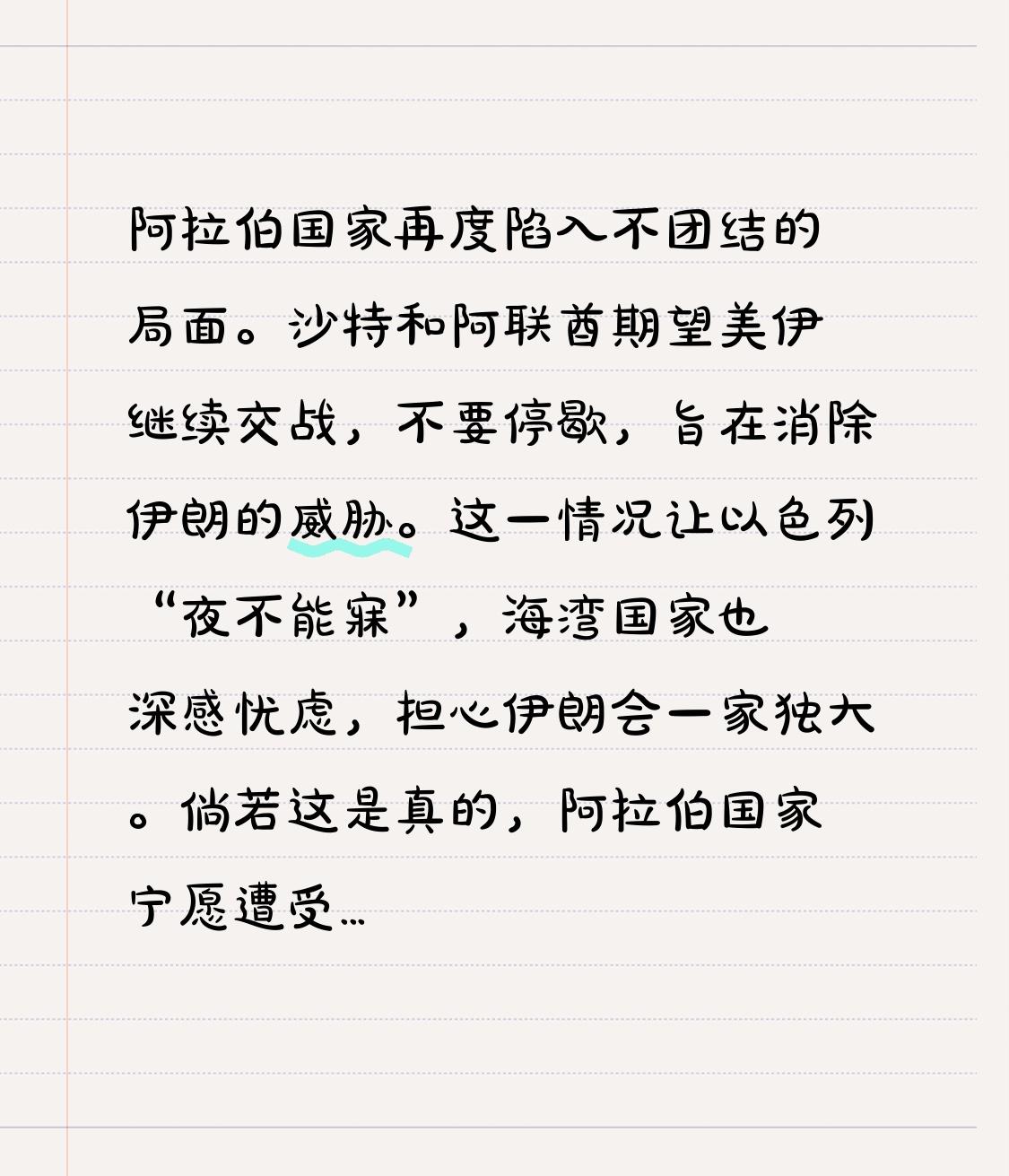 阿拉伯国家再度陷入不团结的局面。沙特和阿联酋期望美伊继续交战,不要停歇,旨在消除