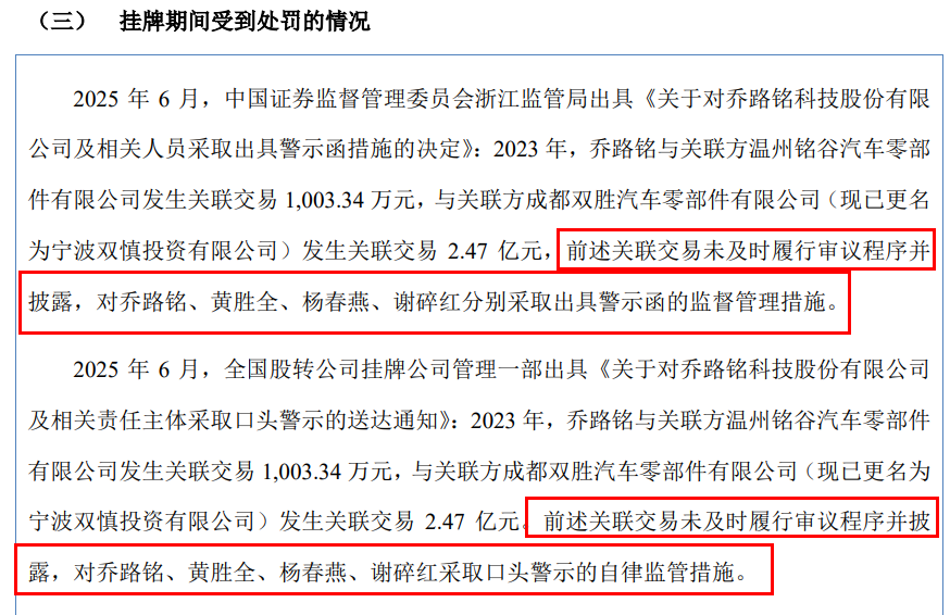 不仅如此,由于乔路铭与关联方温州铭谷汽车、宁波双慎之间发生的关联交易未及时履行审议程序并披露,浙江监管局及全国股转公司均对乔路铭、黄胜全等人出具警示函、采取口头警示的监管措施。