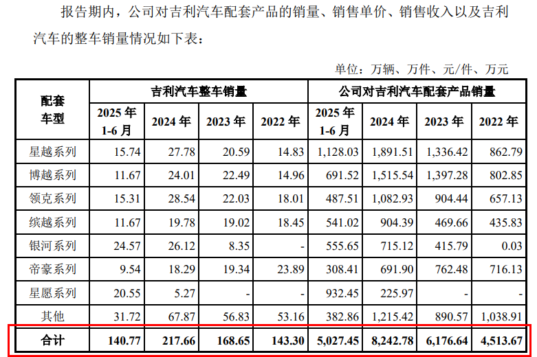 报告期各期,乔路铭对吉利汽车配套产品的销量从2022年的4513.67万件增长到2024年的8242.78万件,两年累计增长82.62%。