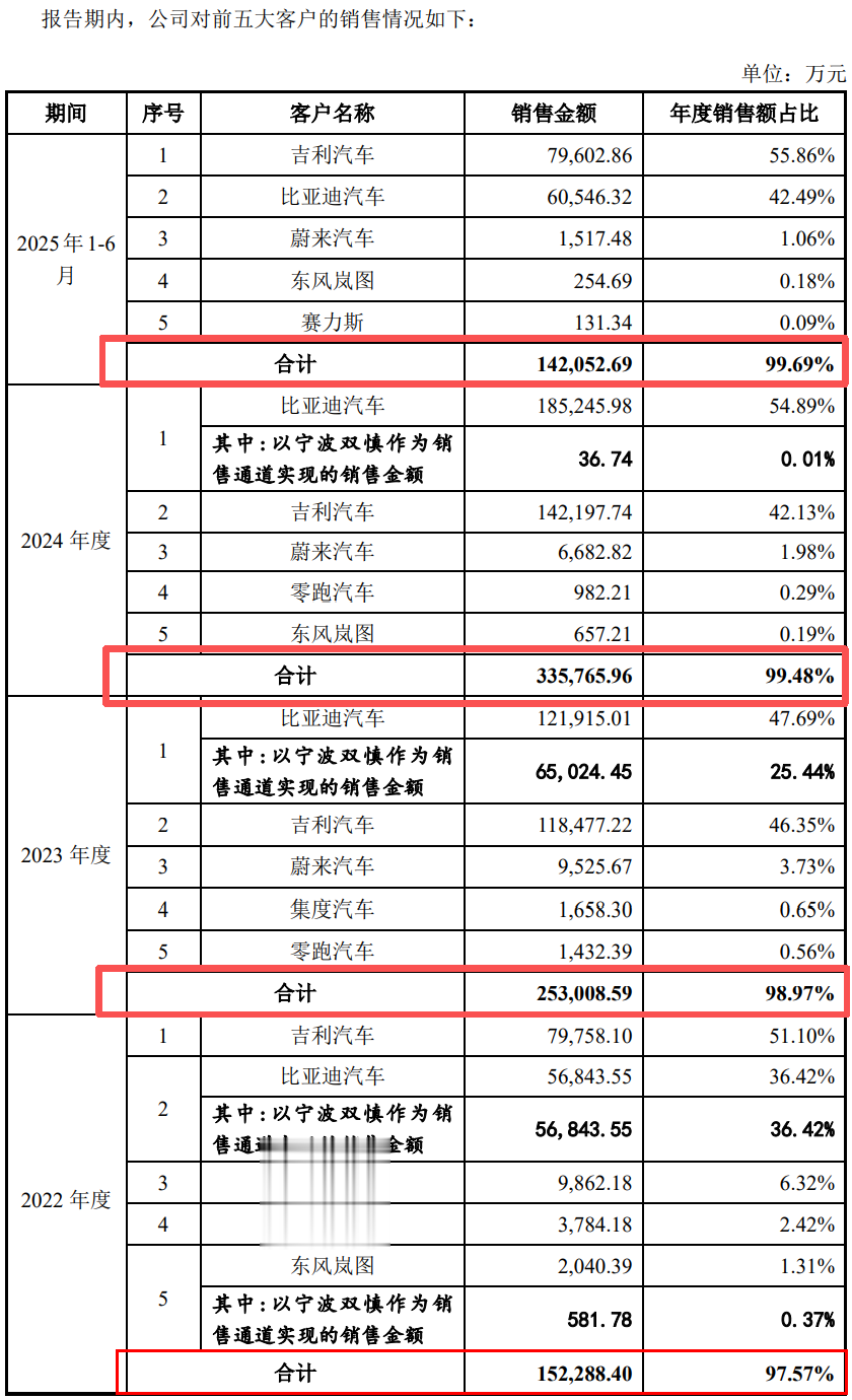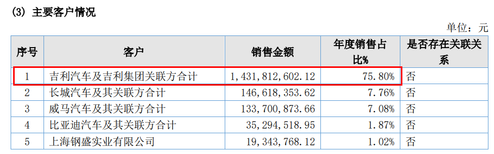 在业绩增长背后,公司客户集中度极高,几乎全部收入来自前五大客户,对比亚迪、吉利尤为依赖。