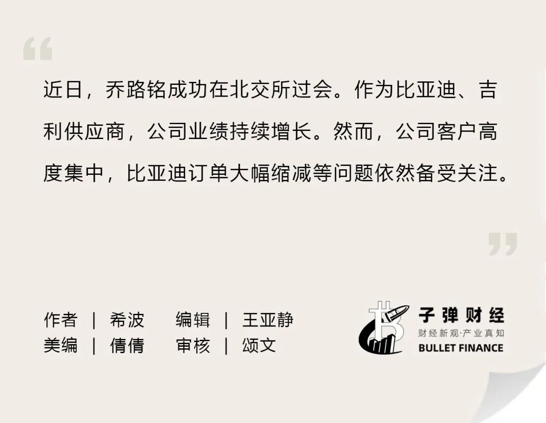 在此背景下,吉利、比亚迪的供应商乔路铭科技股份有限公司(以下简称“乔路铭”)站到了聚光灯下。近日,公司已在北交所过会。