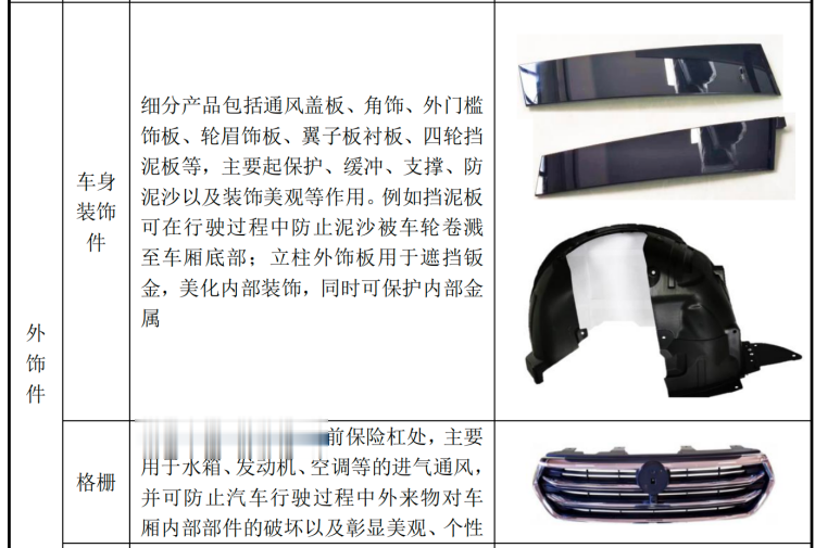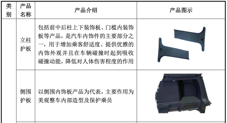 其中,内饰产品涵盖侧围护板、立柱护板、顶棚、地毯等座舱核心系统,外饰产品以格栅总成、扰流板、行李架等为主。