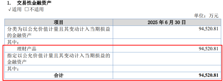 截至2025年中期末,乔路铭的货币资金为4.63亿元。此外,公司交易性金融资产高达9.45亿元,均为理财产品。