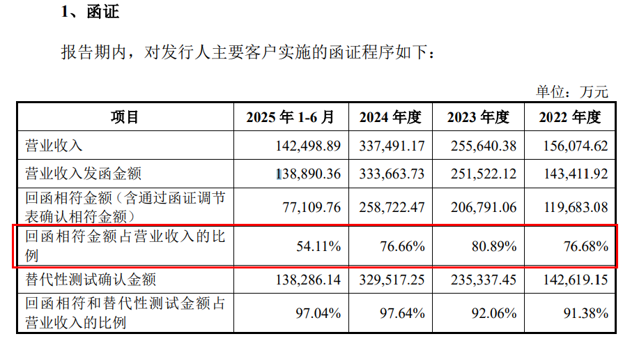 报告期内,保荐机构、申报会计师对乔路铭主要客户实施了函证、走访等核查程序。其中,收入方面各期回函相符金额占营收比例分别为76.68%、80.89%、76.66%和54.11%,呈逐年下降趋势。