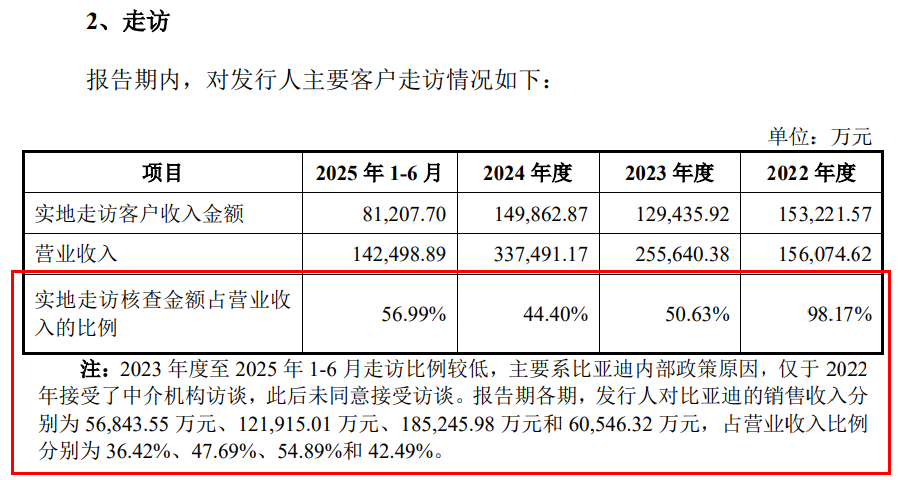 在走访方面,报告期各期,中介机构实地走访核查金额占营收比例分别为98.17%、50.63%、44.40%和56.99%。