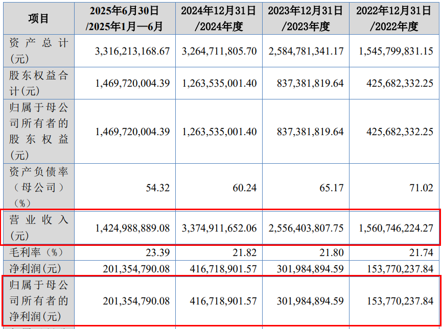 2022年至2025年上半年(以下简称“报告期”),乔路铭实现营业收入15.61亿元、25.56亿元、33.75亿元和14.25亿元;归母净利润分别为1.54亿元、3.02亿元、4.17亿元和2.01亿元,营收、利润均保持增长趋势。