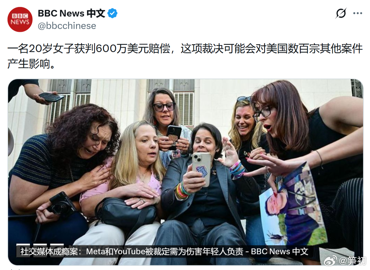 BBC:美国洛杉矶一个陪审团做出一项前所未有的裁决,支持一名因童年沉迷社交媒体而起诉Meta和YouTube平台的年轻女性。陪审员认定,社交媒体平台损害了一名20岁女子的心理健康,这名20岁的女性将获得600万美元的赔偿。Meta和谷歌分别表示不同意判决,并将提出上诉。美国类似的判决和案例看多了你就会发现,什么吃坏肚子获得高额赔偿、在商场滑倒获得高额赔偿、吃错了药获得高额赔偿、工伤获得高额赔偿......等等类似彰显美国法制健全压根保护美国人民的案例基本都是个例,完全没有普遍性。但是它们会大肆宣扬这种个例,就跟它们在飓风、山火和暴雨中死了上百人但是他们救了一只猫一样,明明政府救援不力但是搞得它们好像多负责多有爱心一样。