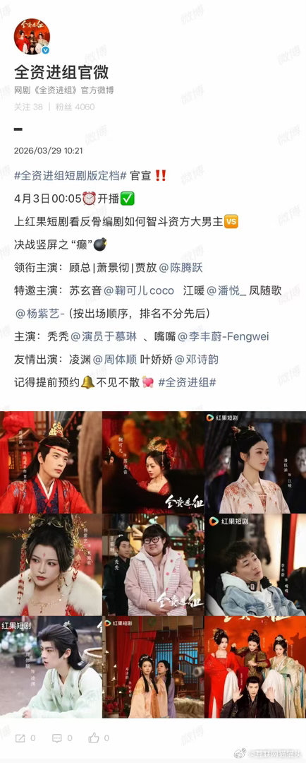 全资进组短剧版定档《全资进组》短剧版定档啦!资方亲自上阵当男主,各种角色来回切换,把娱乐圈那些事儿疯狂吐槽,又敢说又好笑,坐等开播!全资进组
