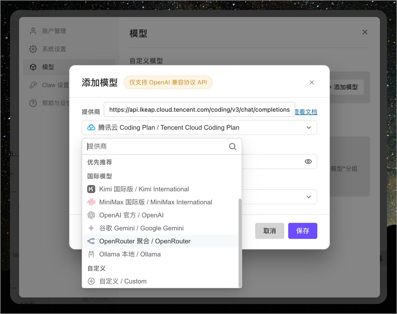 WorkBuddy 上线自定义模型功能,可以更加灵活的使用主流模型了,比如: 1. 国内推荐:腾讯云 Coding Plan、智谱 GLM、Kimi、MiniMax、DeepSeek 等; 2. 国际模型:OpenAI 官方、Gemini 官方、OpenRouter、Ollama 本地 对于 Ollama 本地模型,甚至还支持设置工具调用、图片输入、推理模式、输入输出上下文长度等。 当然还有完全自定义的模型提供商,仅支持 OpenAI 兼容协议 API。 操作步骤: 1. 进入「模型」配置界面 ,点击「添加模型」按钮 2. 从下拉菜单选择预置提供商(腾讯云/智谱/Kimi等)或「自定义」选项 3. 填写API Key及模型参数(如接口地址、推理模式等) 4. 保存配置 补充: WorkBuddy 是腾讯推出的全场景职场 AI 智能体桌面工作台,面向各类职能角色设计。您只需用一句话描述需求,WorkBuddy 便能像同事一样自主规划和执行任务,并交付可验收的结果。