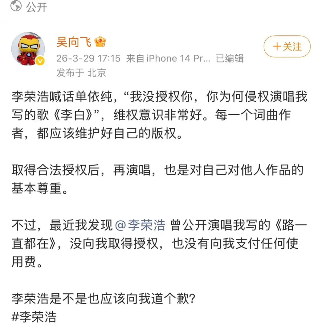 李荣浩肯定不是冲着《李白》的侵权,而和单依纯闹翻,在这一篇的千字长文中,李荣浩提