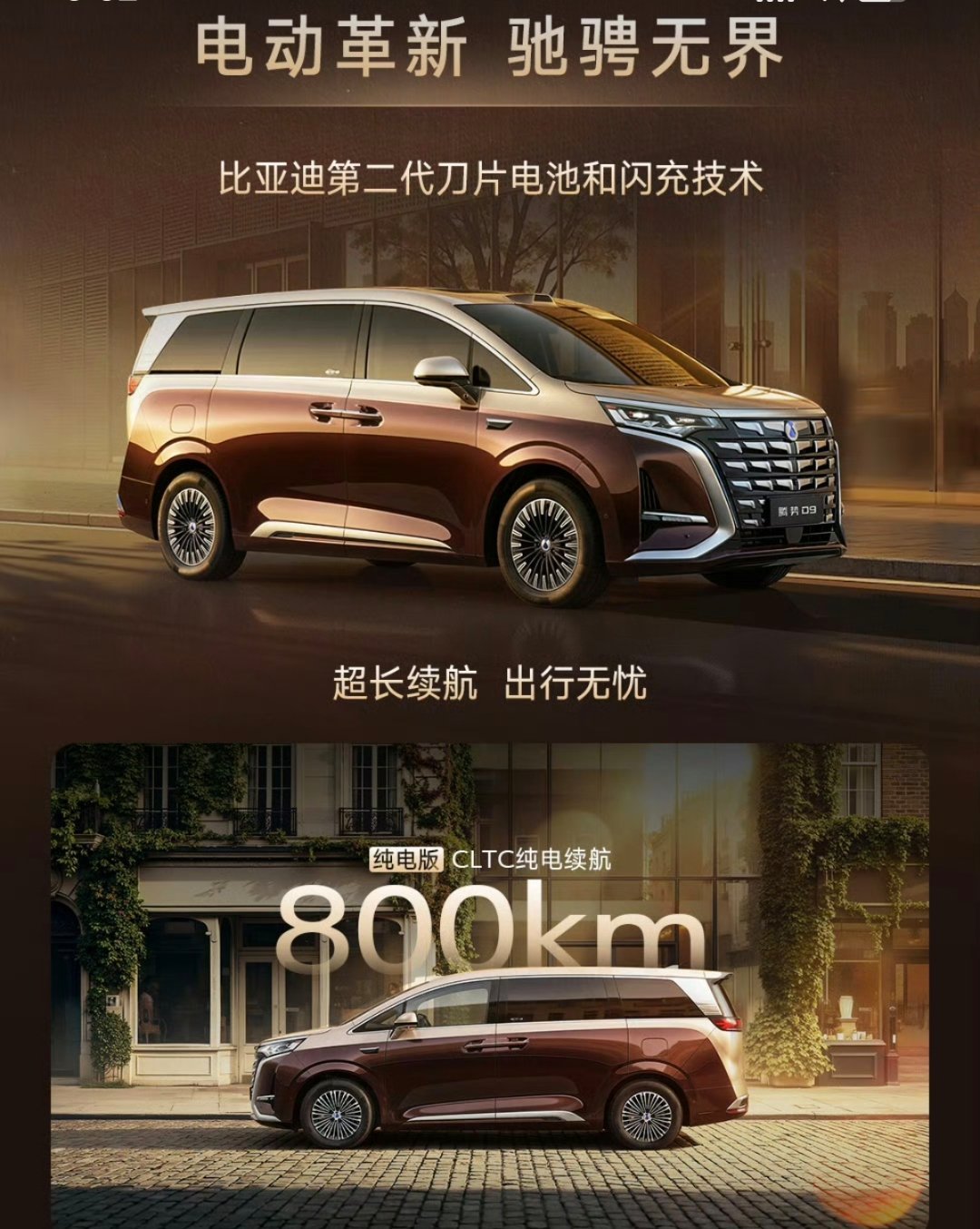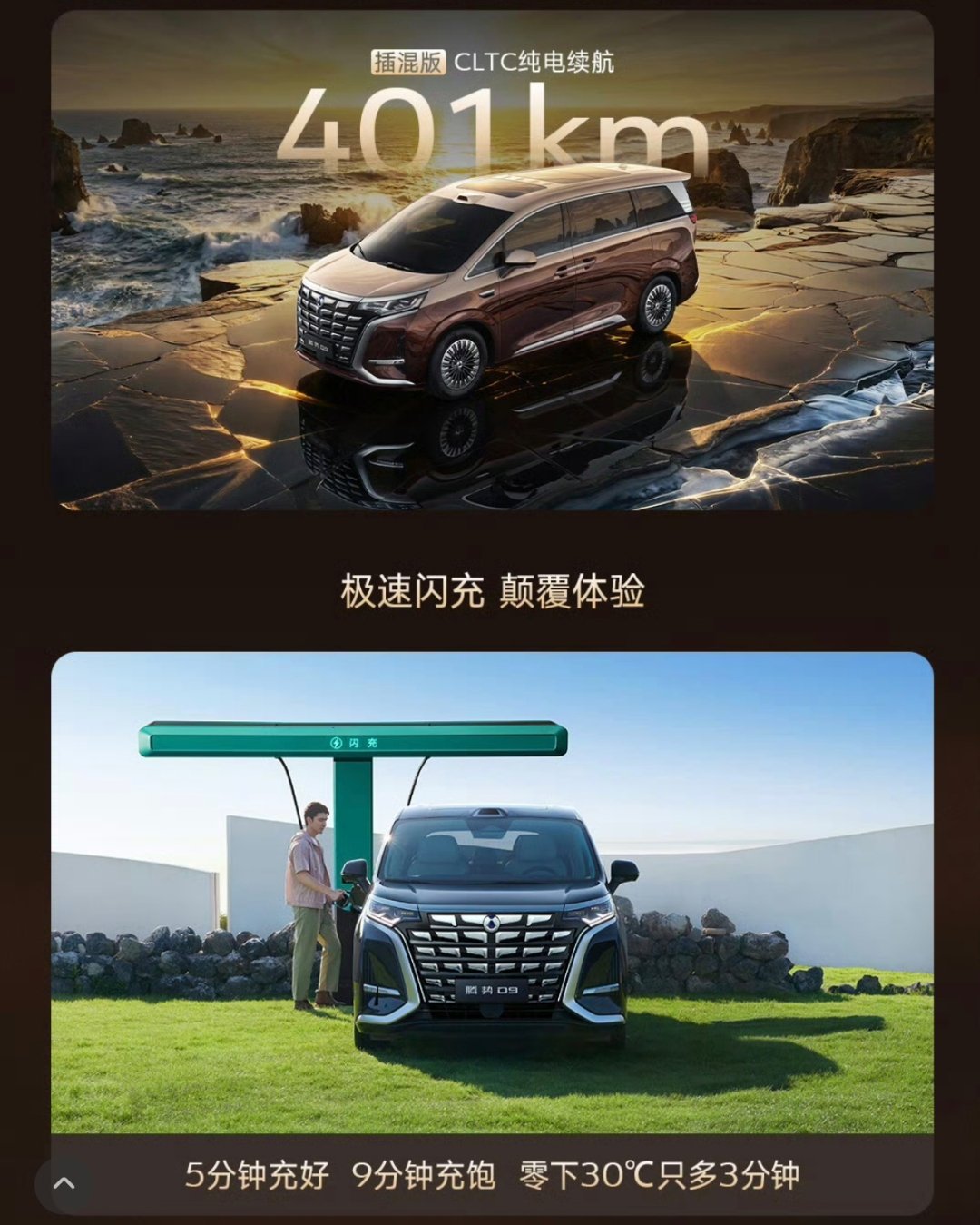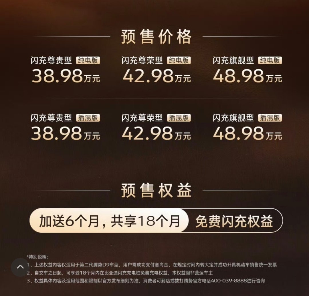 汽车分享 3月29日,腾势汽车新款腾势D9正式开启预售,推出纯电版和插混版共6款闪充车型,预售价区间为38.98万-48.98万元,据了解,新车搭载第二代刀片电池及闪充技术,全系标配激光雷达和和天神之眼5.0,插混版CLTC纯电续航里程最高401公里,纯电版预计最高续航里程达800公里。