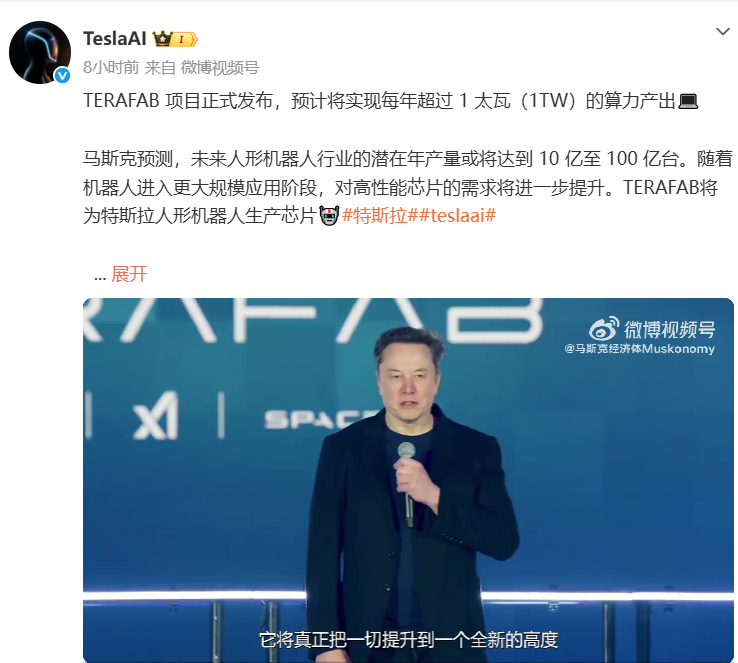 3月30日,TeslaAI官方微博发布消息称,正式启动TERAFAB超级芯片工厂项目,预计将实现每年超过1太瓦(1TW)的算力产出,这相当于当前全球AI芯片年总算力产出的约50倍。马斯克表示,这将是迄今为止最宏大的芯片制造项目。