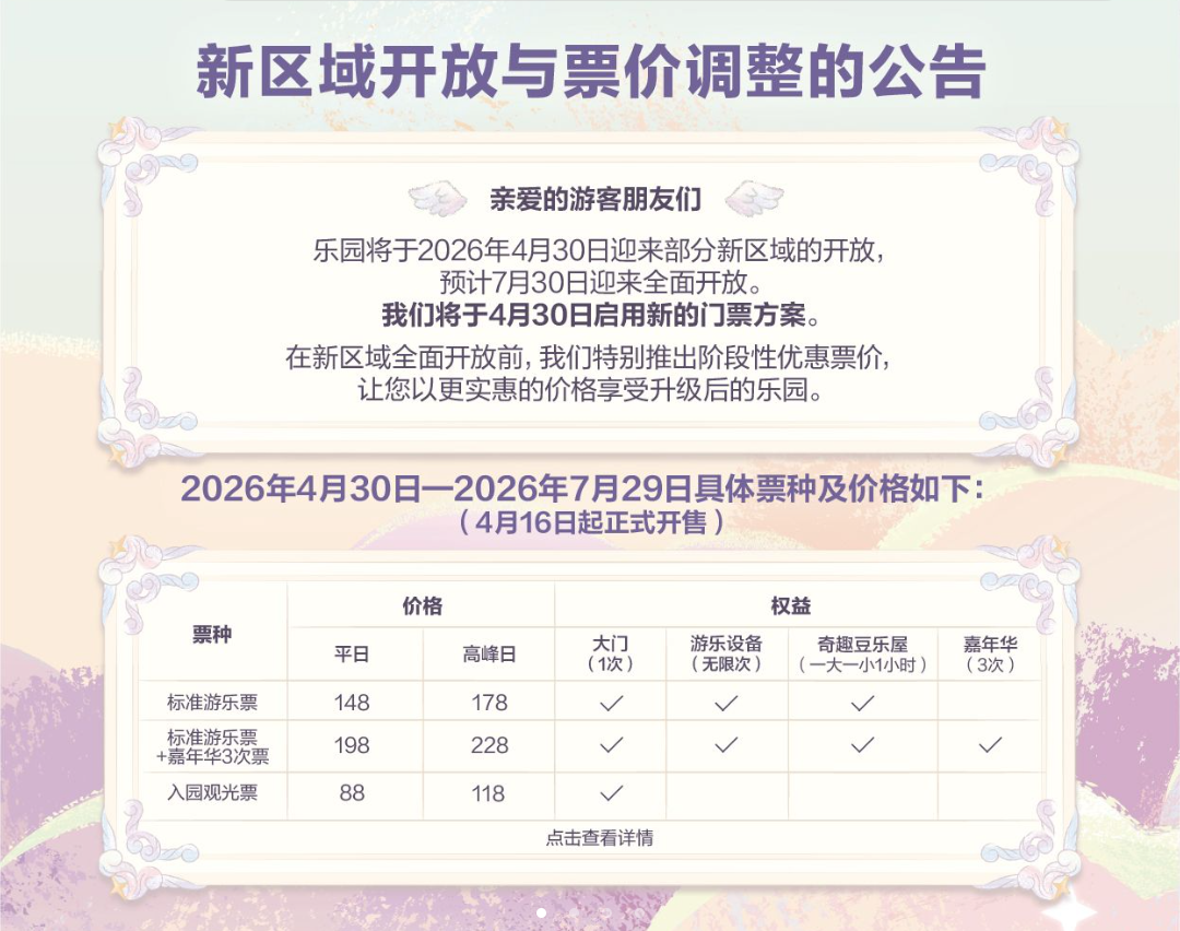 3月30日,泡泡玛特城市乐园小程序发布调价公告称,将于2026年4月30日迎来部分新区域的开放,预计7月30日将实现全面开放,拟于4月30日启用新的门票方案。