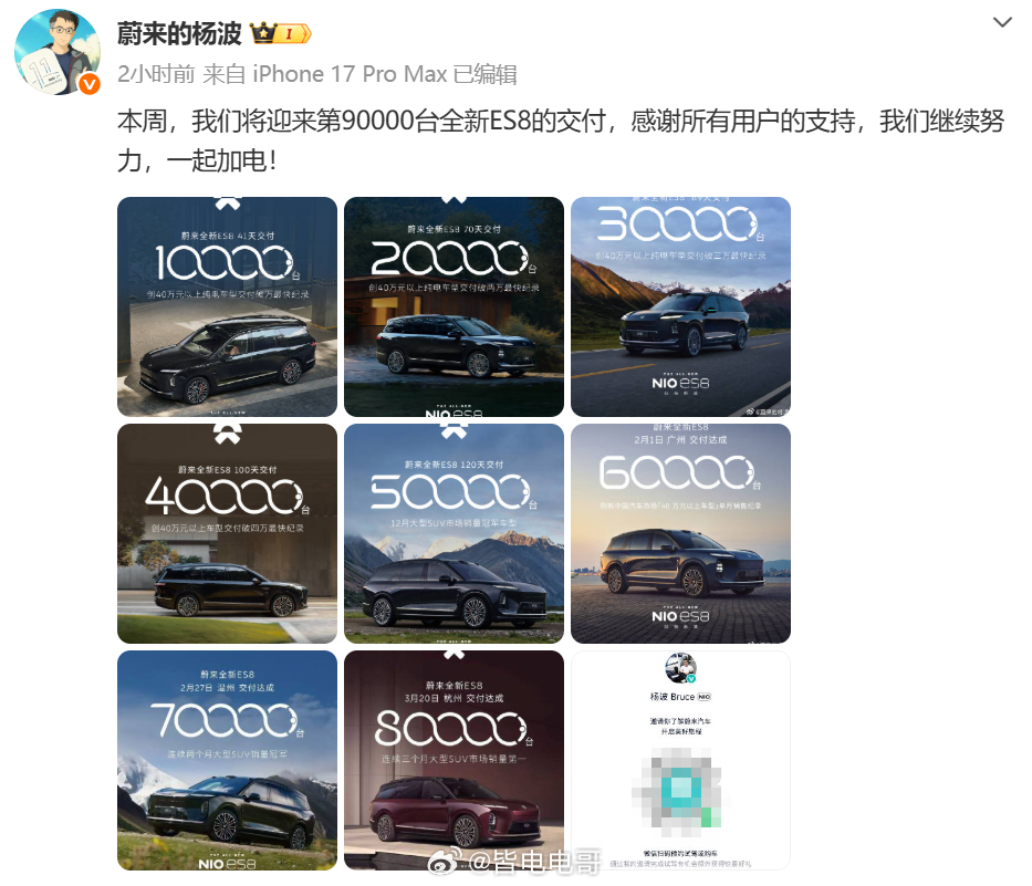 蔚来全新es8 这周就要交付90000台帮大家看过了,上一次80000台交付就发