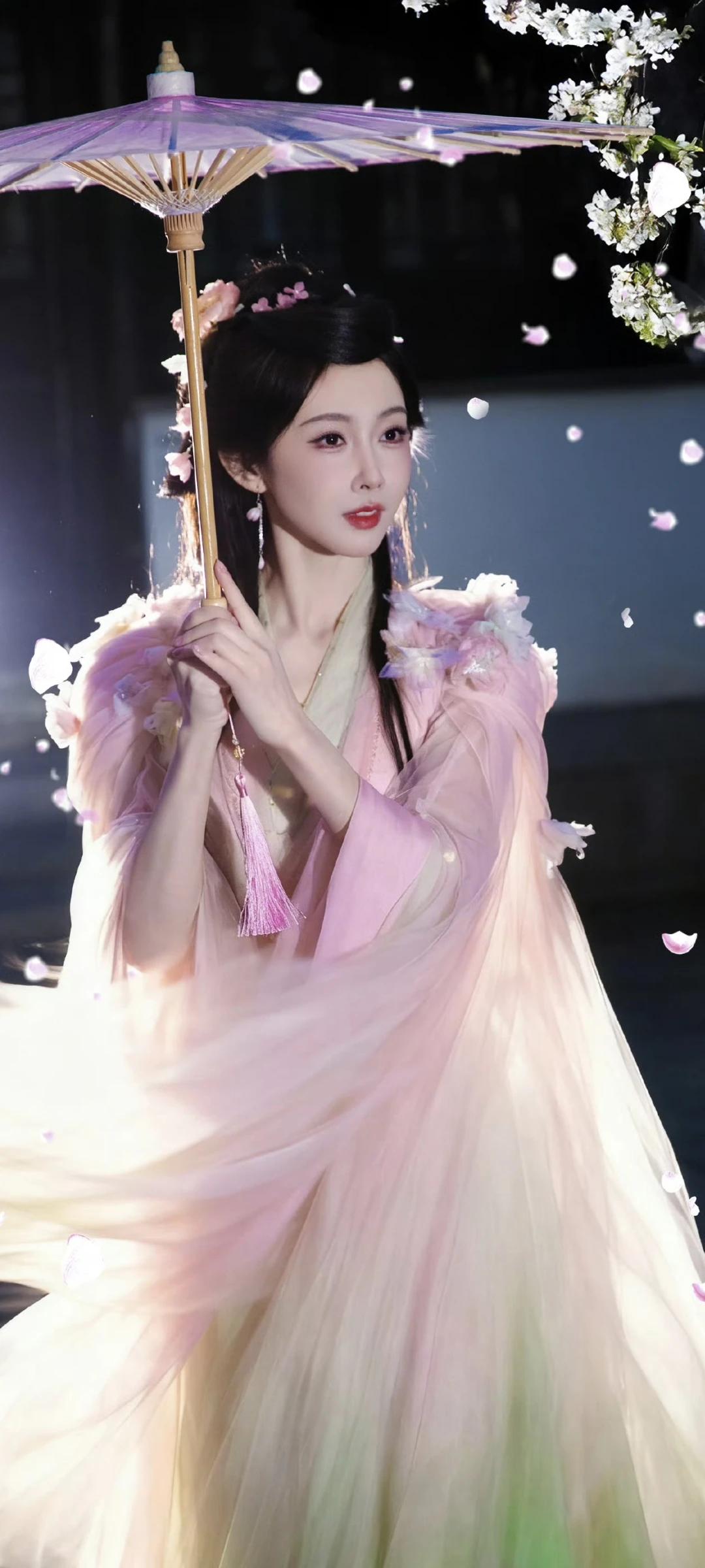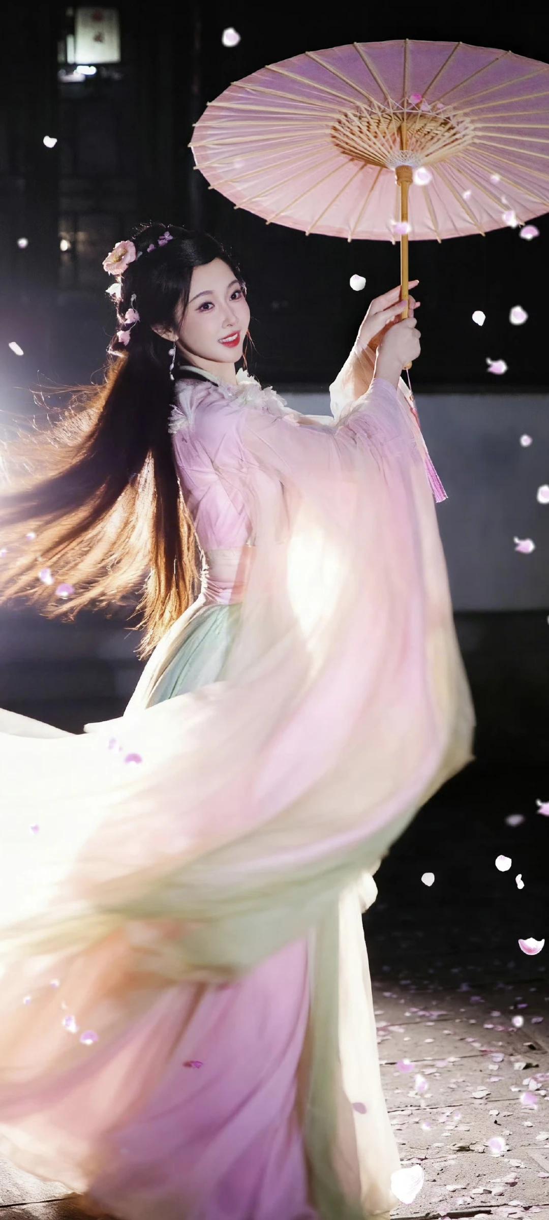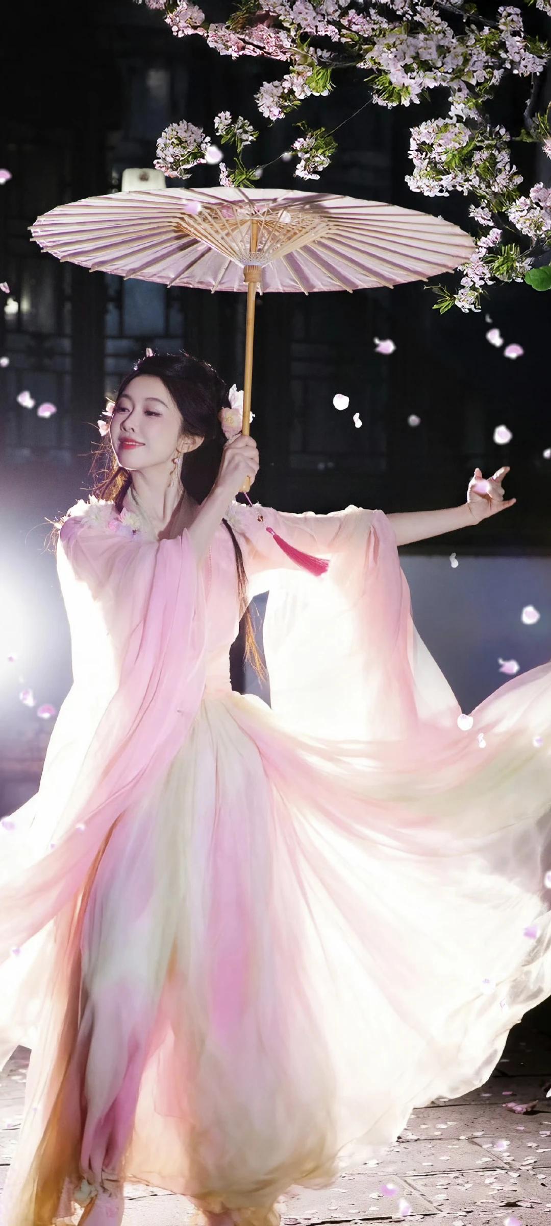 宣璐古风壁纸~ 夜樱、彩裙、纸伞,这般模样恰似古装剧中的仙子。