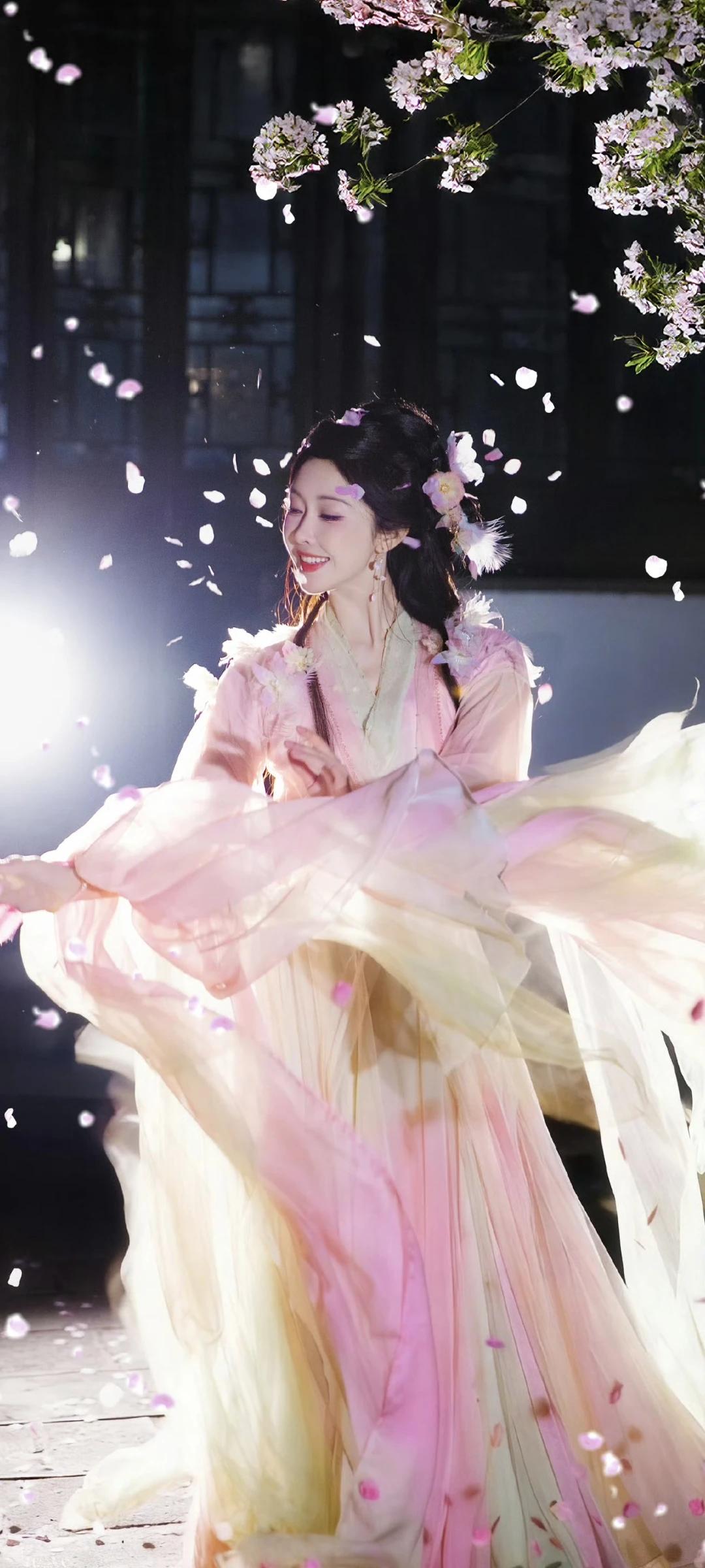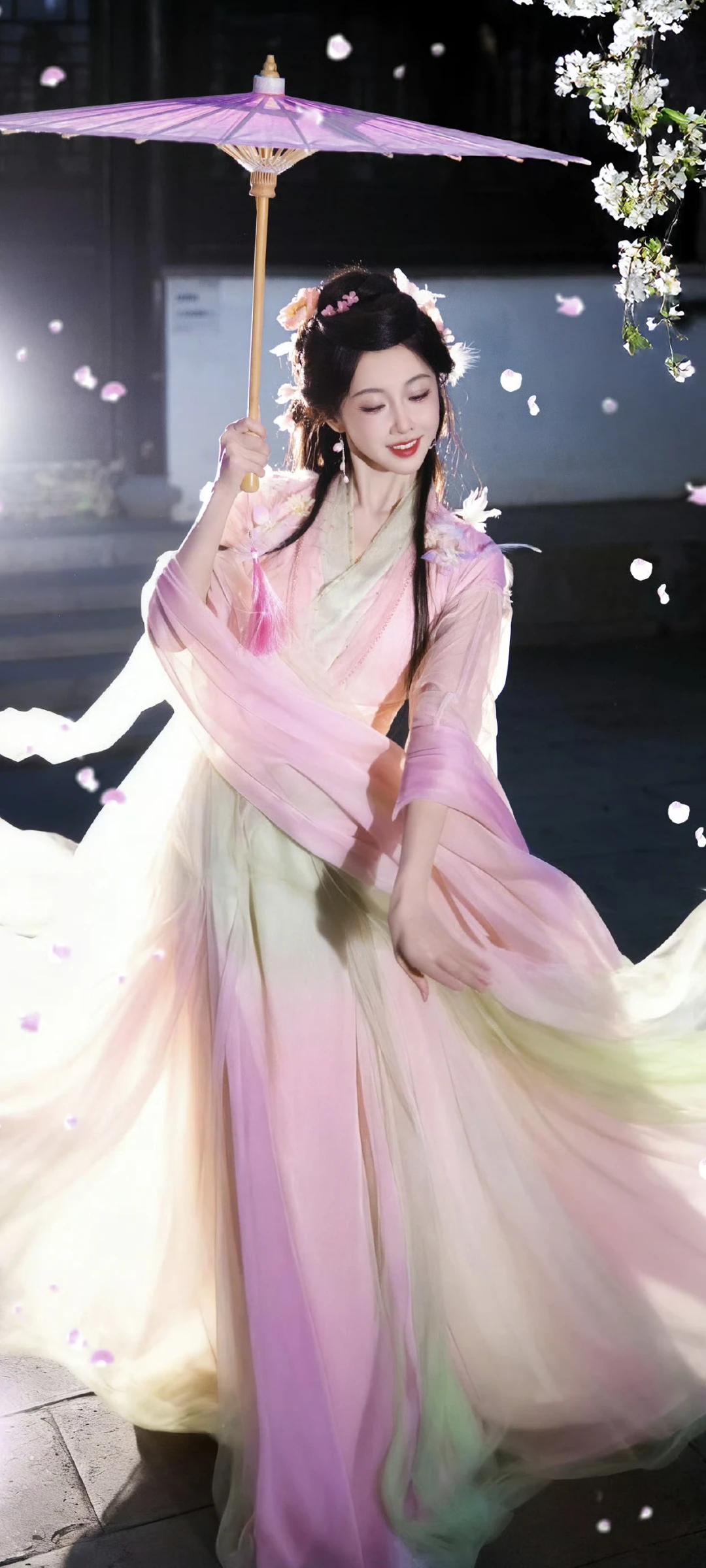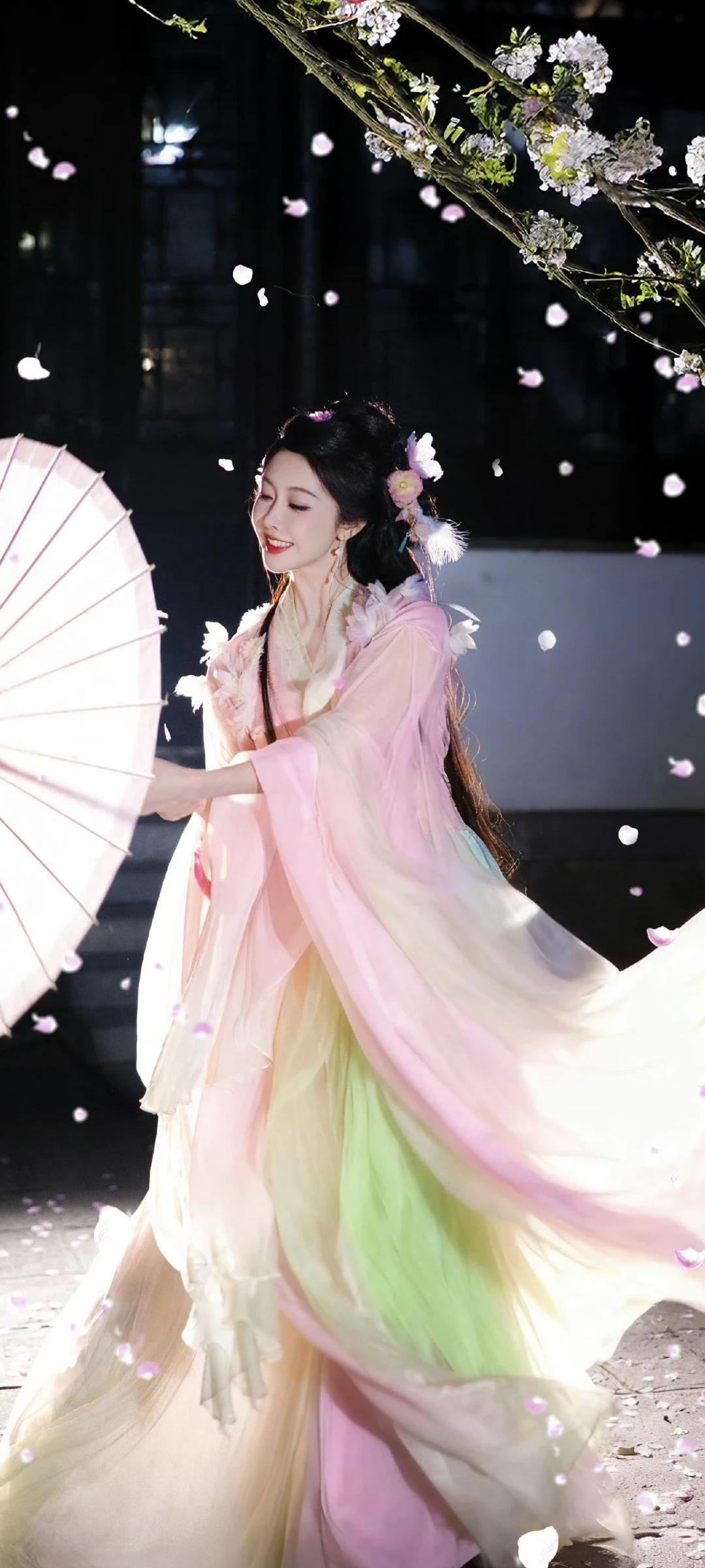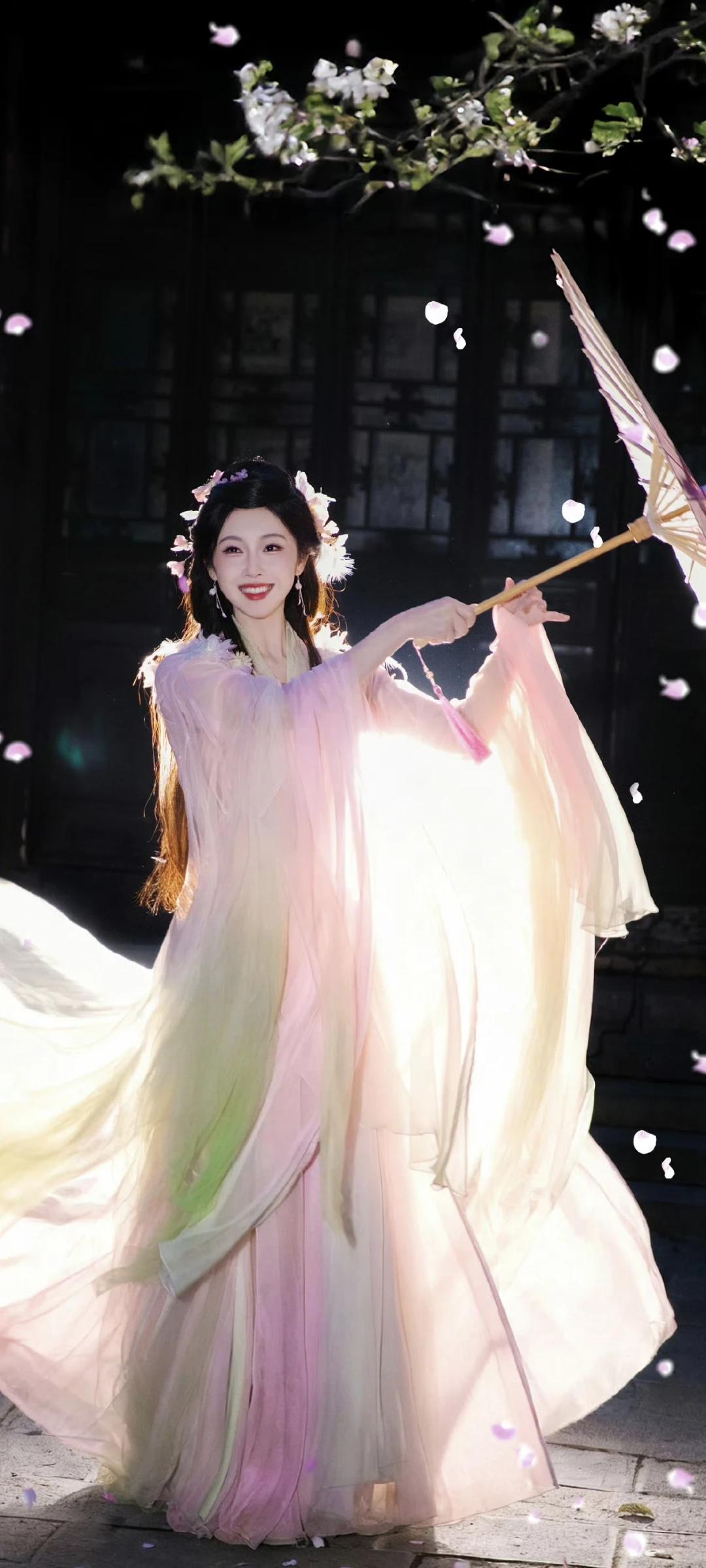 宣璐古风壁纸~ 夜樱、彩裙、纸伞,这般模样恰似古装剧中的仙子。